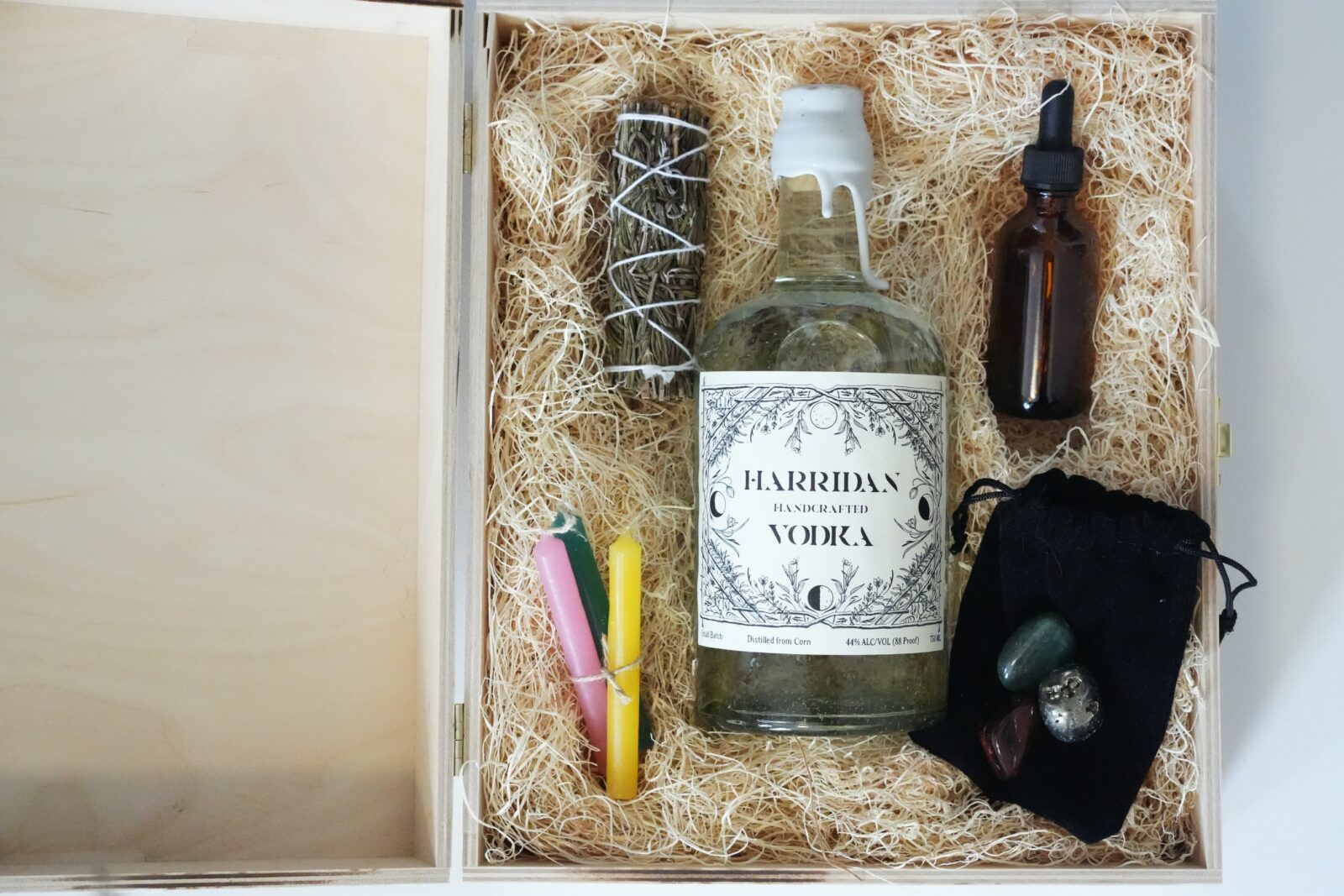 The expression was created in partnership with The Hoodwitch (@thehoodwitch), one of the Internet’s most famous witches who has more than 470,000 Instagram followers. It is packaged in an engraved wood Ritual Box with everything needed to manifest a prosperous and powerful season. Each box includes a rosemary smudge stick, ritual candles, a ritual oil bottle, crystals (Aventurine, Tiger’s Eye and Pyrite) as well as a zine created by The Hoodwitch with exclusive spells, tarot card spreads, Harridan Vodka cocktail recipes and instructions for how to use these tools.