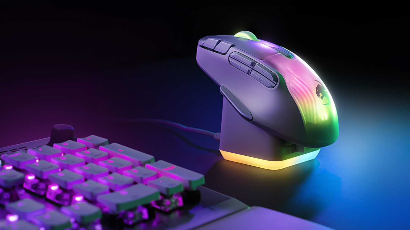 The Kone XP Air comes complete with a stylish AIMO-enabled RGB charging dock. The Kone XP Air is part of the AIMO eco-system allowing the mouse and its charging dock to display up to 16.8 million colors and to communicate with other AIMO-enabled products, such as the Vulcan TKL mechanical RGB gaming keyboard to guarantee a unique lighting experience across gamers’ set-ups. The Kone XP Air’s Rapid Charge Dock provides up to five hours of playtime with just 10 minutes of charge. Fully charged, the Kone XP Air provides up to 100 hours of gameplay. As a backup for gamers who might have forgotten to recharge their mouse, the Kone XP Air also comes with ROCCAT’s PhantomFlex™ USB-C cable.