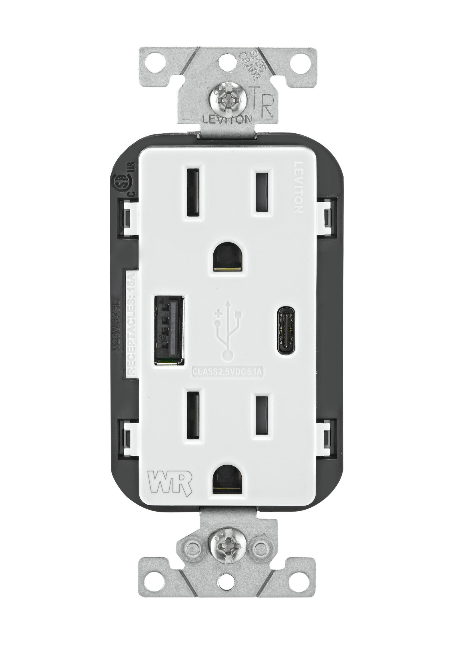 The Leviton Type A/C USB Weather-Resistant Charger/Receptacle is weather-resistant rated to provide added protection against corrosion, UV degradation, and exposure to outdoor elements. The receptacle is also tamper-resistant to help prevent access to the contacts by most non-rated or foreign objects and is available in 15A and 20A models.