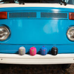 | Astrobotic’s Tom Garvey and Ander Solorzano adds a holographic Peregrine sticker to the mission patches on the DSN trailer’s wall. |
