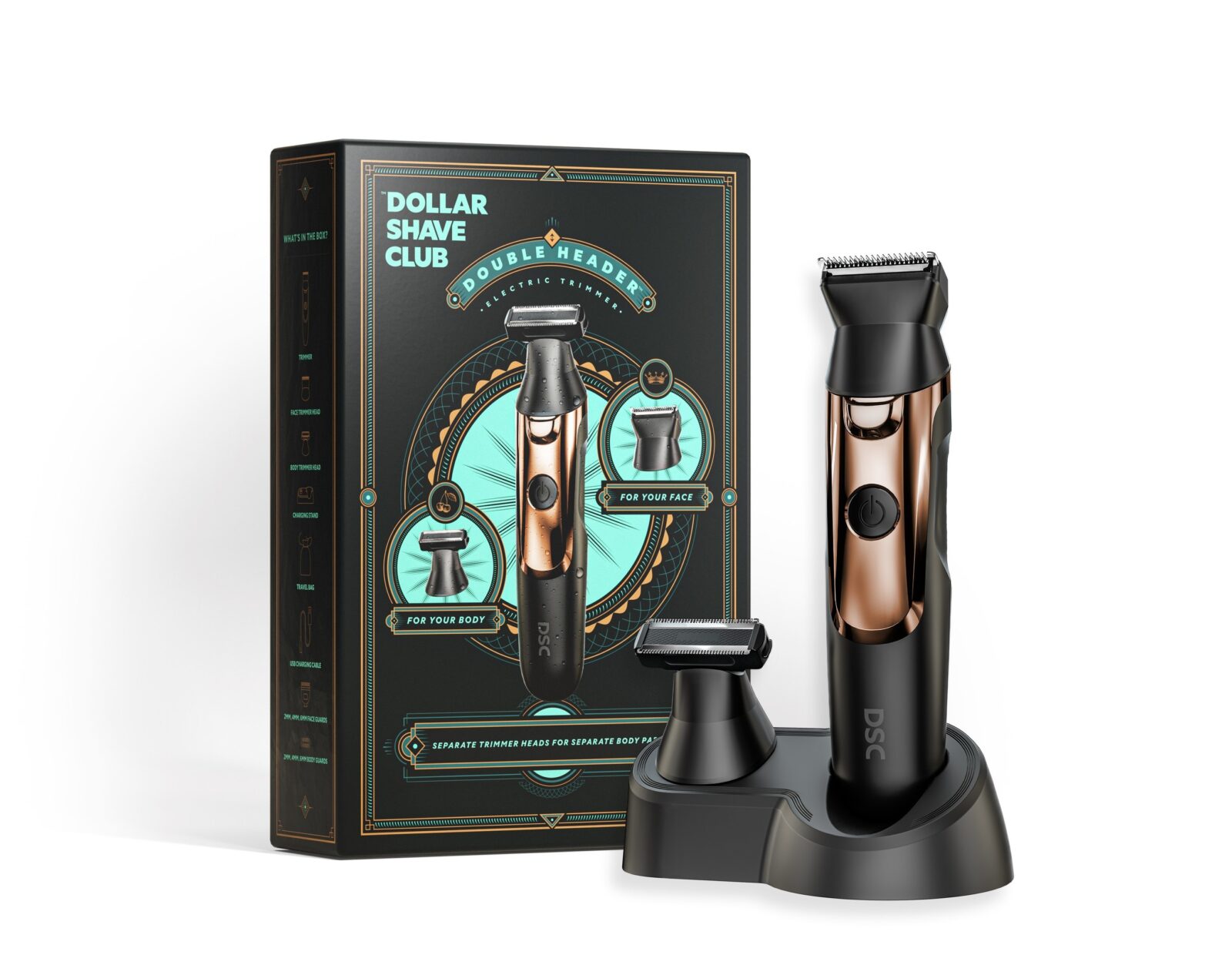 The new Double Header Electric Trimmer™ is available now at Walmart.com for $70 and on November 3rd at DollarShaveClub.com.
