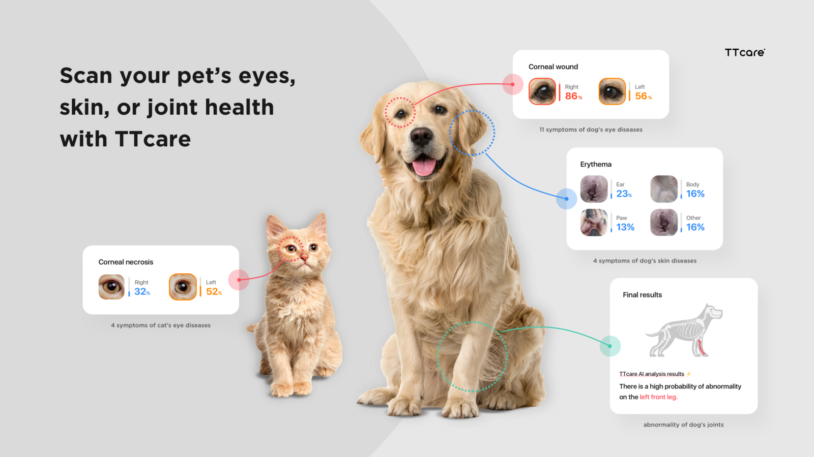 TTcare is a healthcare app for pets that detects signs of diseases and health issues. After taking a photo of your dog or cat, TTcare’s AI software analyzes the image and informs the user of potential eye, skin, or joint-related diseases and conditions. These preventative measures allow quicker treatment to increase pets’ lifespan and quality of life.