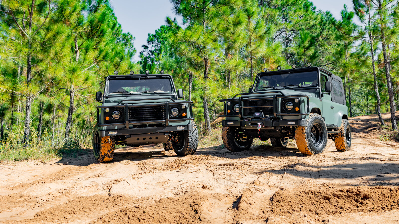 From the outside, the utterly bespoke vintage Land Rover Defender 90s are nearly indistinguishable – from the 16″ black deep dish wheels with matching lug nuts underneath to the four LED spotlights on top of the roll cage. The sporting eggshell Keswick green exteriors are complimented with older Defenders’ black canvas roofs, the ideal background for family photos at any destination. Additional features the restored Defenders have in common include Borla Sport exhaust with one pipe on each side, 6-speed automatic transmission and EBC fast brakes.