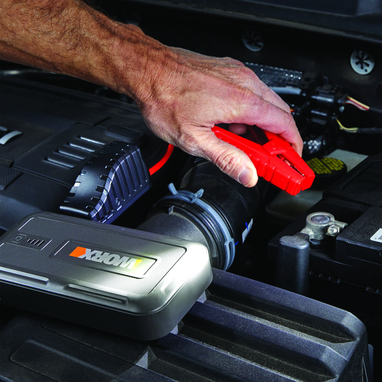 Included with the compact jump starter are a set of battery cables with clips, a USB-C charging cable and carrying case. The jump starter is covered by the WORX three-year limited warranty.