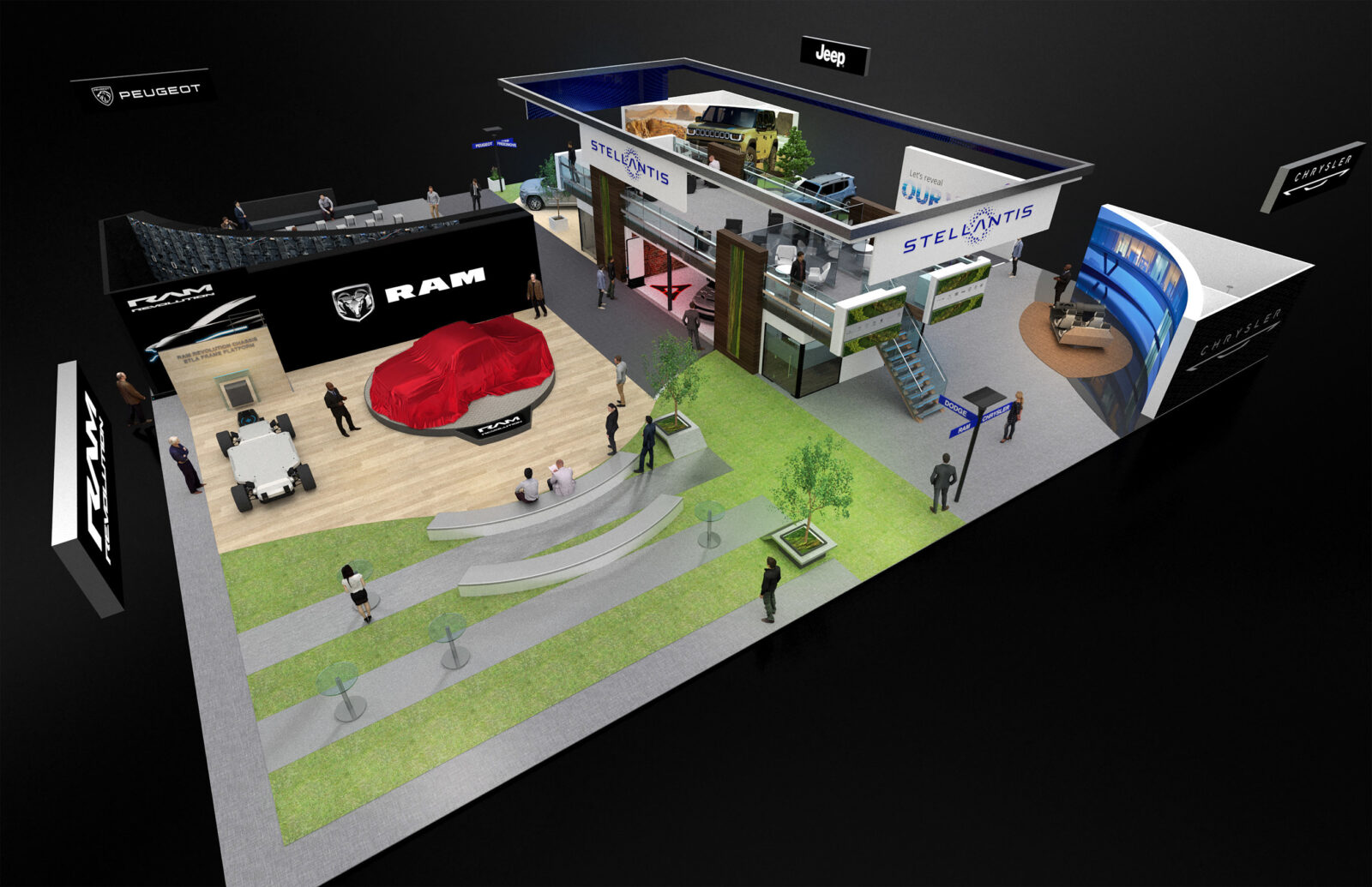 Elements of the Stellantis display, located in the West Hall of the Las Vegas Convention Center, at CES 2023 include: