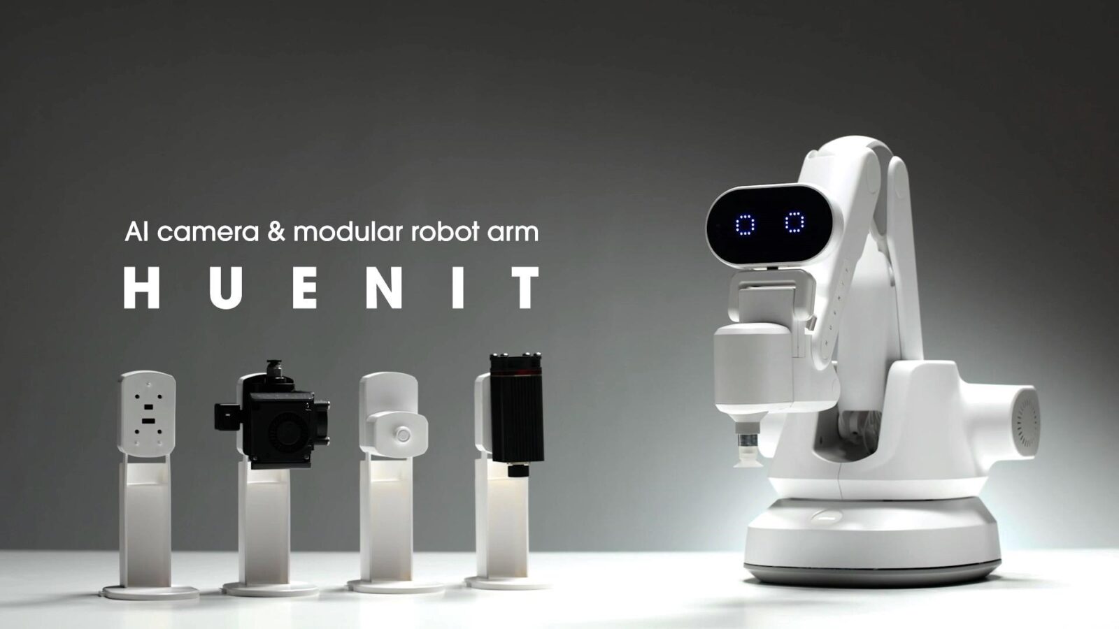 HUENIT is an easy-to-use, multi-functional, high-precision AI modular robot arm for Maker and STEAM education. HUENIT supports AI vision, laser engraving, 3D printing, robotic gripper, writing and drawing functions, and also has a customizable module. HUENIT supports various development environments such as visual programming (block based coding), Python, and Arduino (C++) programming. In addition, you can learn and experience the entire process of artificial intelligence training using Tensorflow. (AI accelerator (NPU) is built into the HUENIT camera module) All functions can be easily learned and utilized by beginners through the HUENIT SW platform.