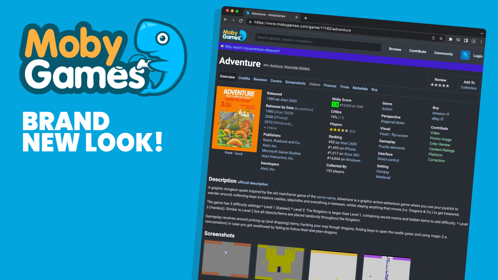Atari and the team behind MobyGames are pleased to share that all game and account information, contributions, game collections, reviews, images, and more have been successfully migrated to the new website. These include: