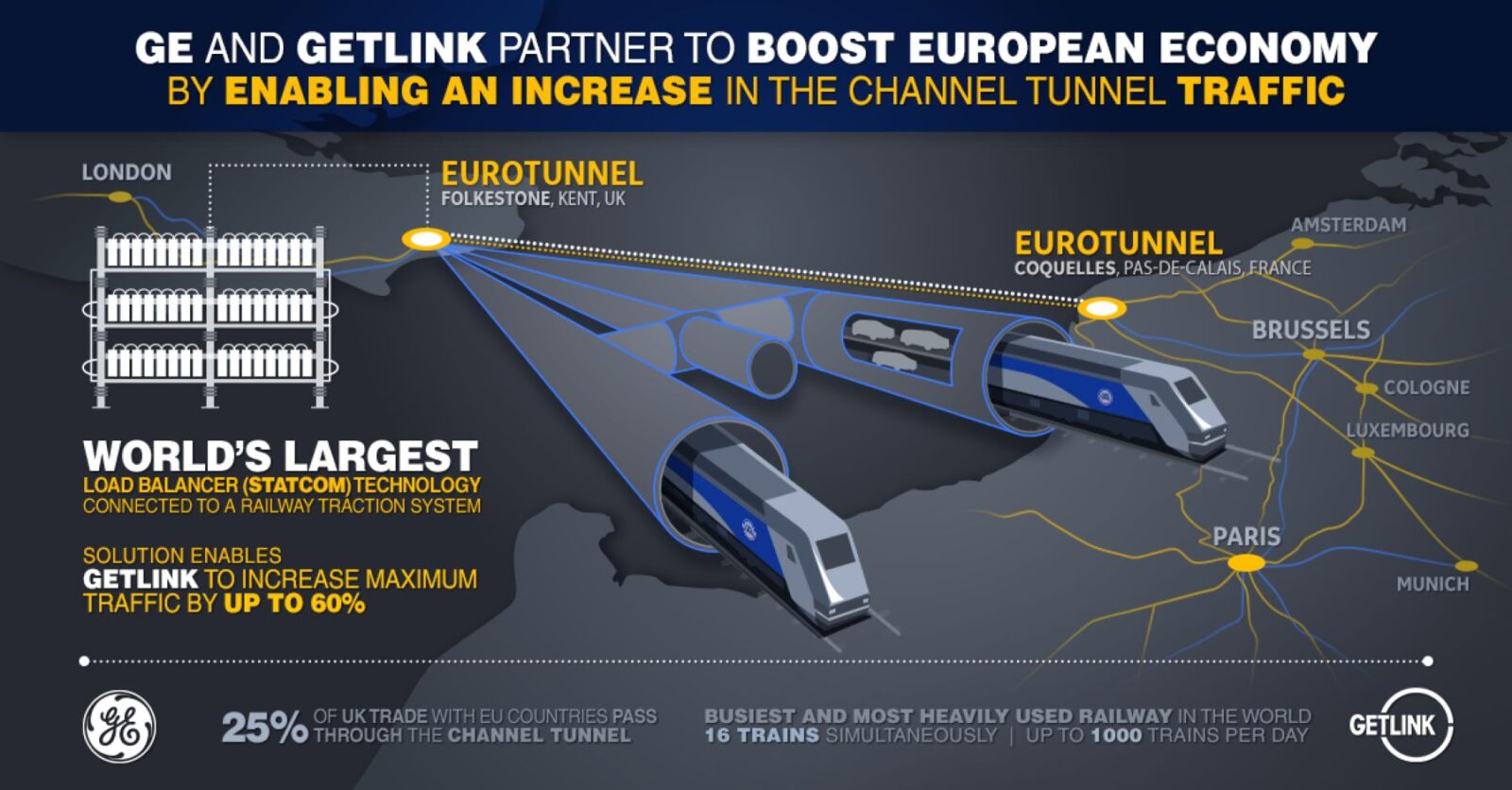 The Channel Tunnel, the longest undersea tunnel in the world, reached a technological milestone with Getlink’s commissioning of a high-voltage grid solution from GE Renewable Energy’s Grid Solutions business [NYSE:GE]. GE’s flexible Static Synchronous Compensator (STATCOM) solution delivers the fast voltage support Eurotunnel requires to be able to run up to 16 trains simultaneously in the Channel Tunnel – a 60% increase in maximum capacity or as many as 1,000 trains per day.