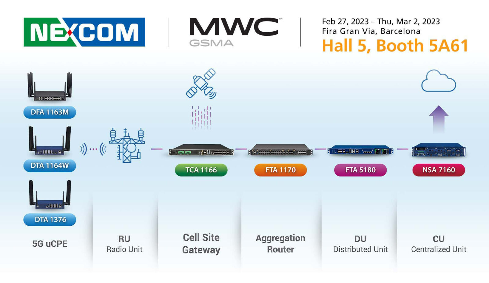 NEXCOM, a leading supplier of network appliances, proudly announces its participation in MWC 2023 Barcelona, under Taiwan Pavilion supported by Industrial Development Bureau, MOEA, Taiwan. For this event, NEXCOM gathered its latest network Intel-based appliances to meet the requirements of 5G O-RAN network. The products to display cover all essential parts of 5G network infrastructure: 5G uCPE, cell site gateway, switch, distribution unit (DU), and central unit (CU).