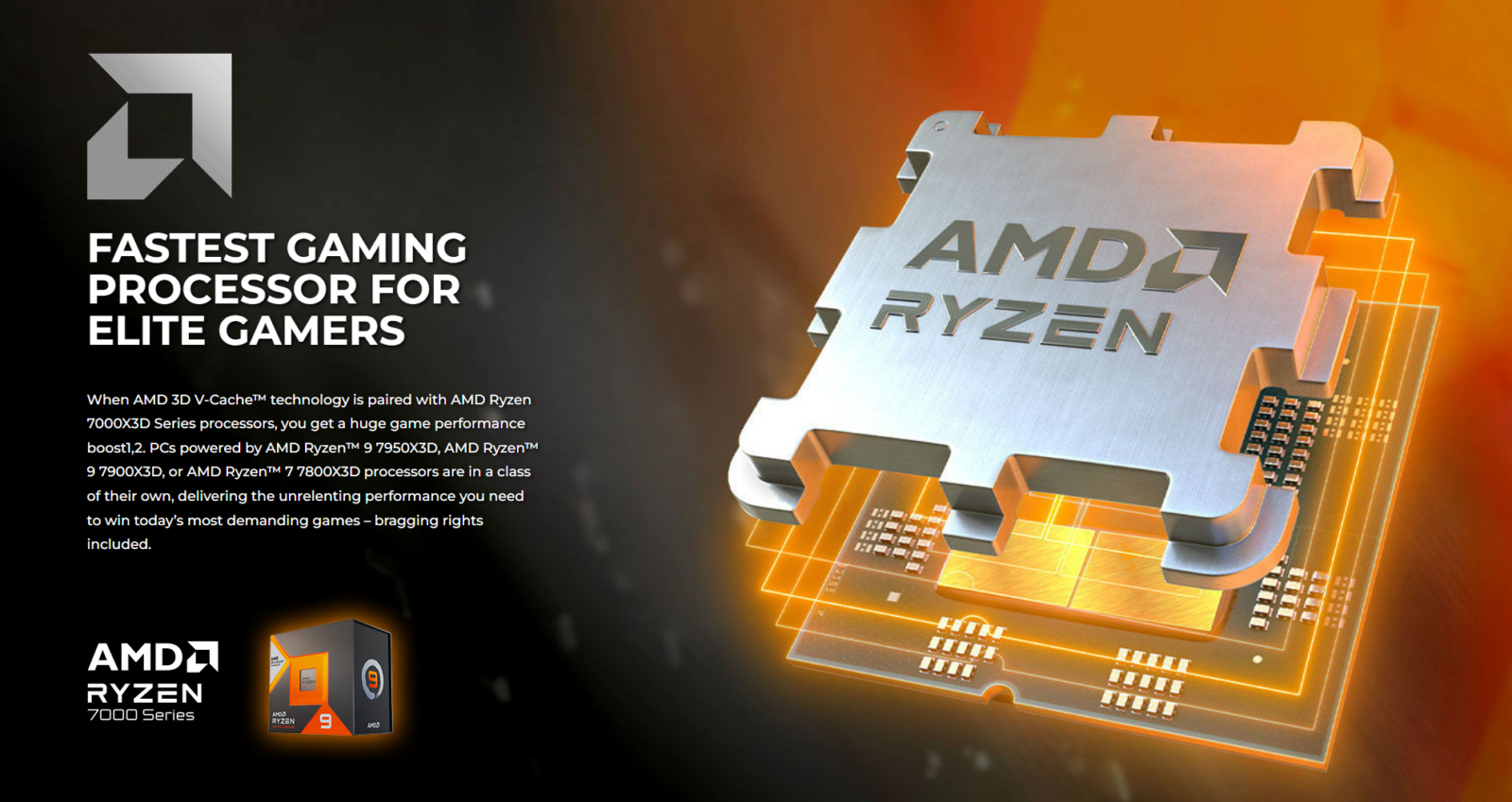 • AMD 3D V-Cache Technology: New AMD Ryzen™ 7000 Series Processors with 3D V-Cache technology leverage the existing “Zen 4” architecture and pack on up to a staggering 128MB of L3 cache — for increased  gaming performance than non-3D V-Cache variant AMD Ryzen™ 7000 Series CPUs.