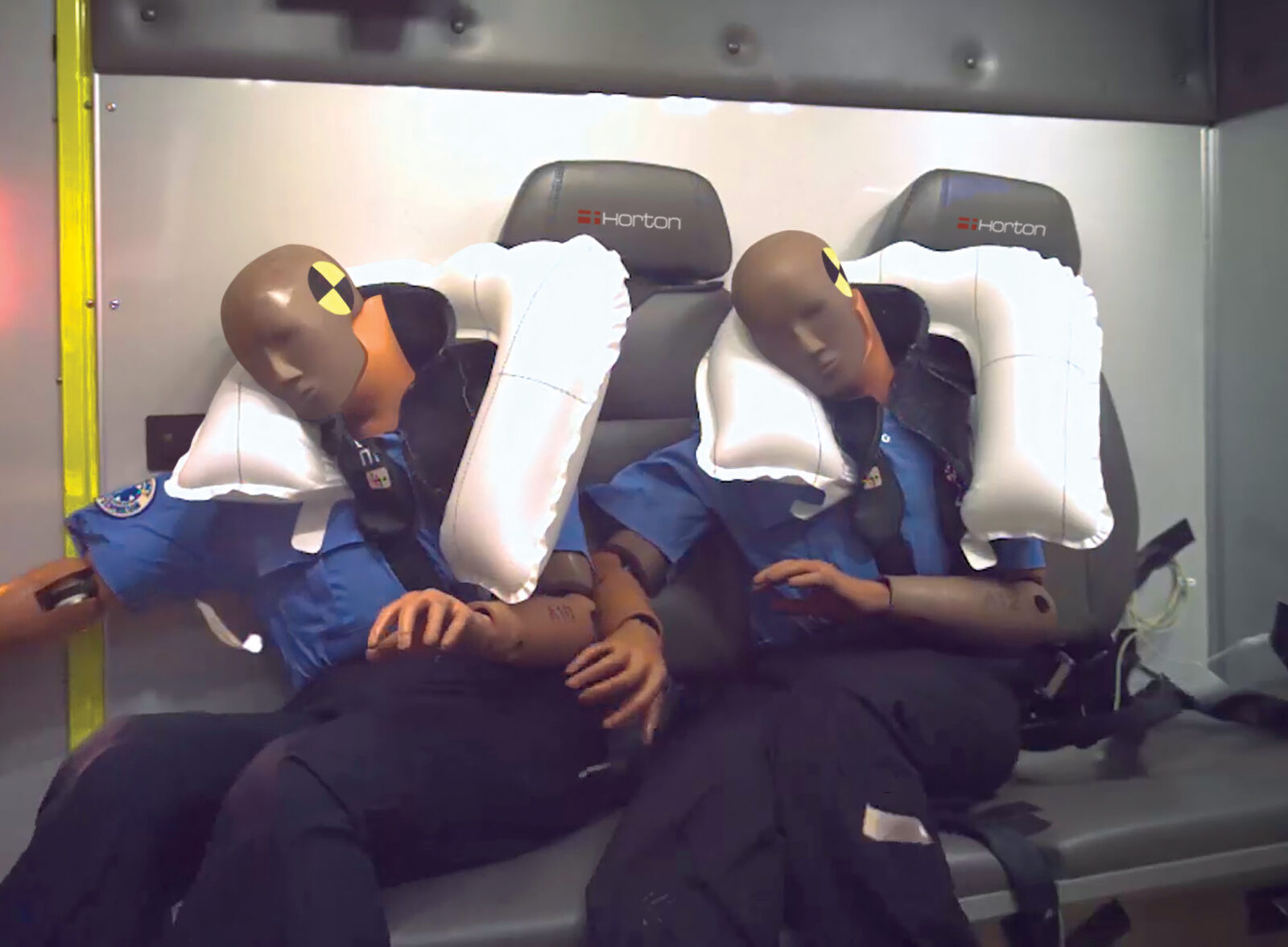 Independent data indicates that nearly 80% of accidents with ambulances that resulted in fatalities and serious injuries were frontal impacts*. MBrace was developed to provide more protection against head and neck injuries during frontal impact collisions, in addition to ambulance rollovers. MBrace integrates an airbag into an innovative multi-point restraint that both protects emergency care providers while allowing them the mobility and freedom to work. Designed and engineered by IMMI and tested extensively with Horton ambulances at the Center for Advanced Product Evaluation (CAPE), MBrace takes EMS protection to a new level.