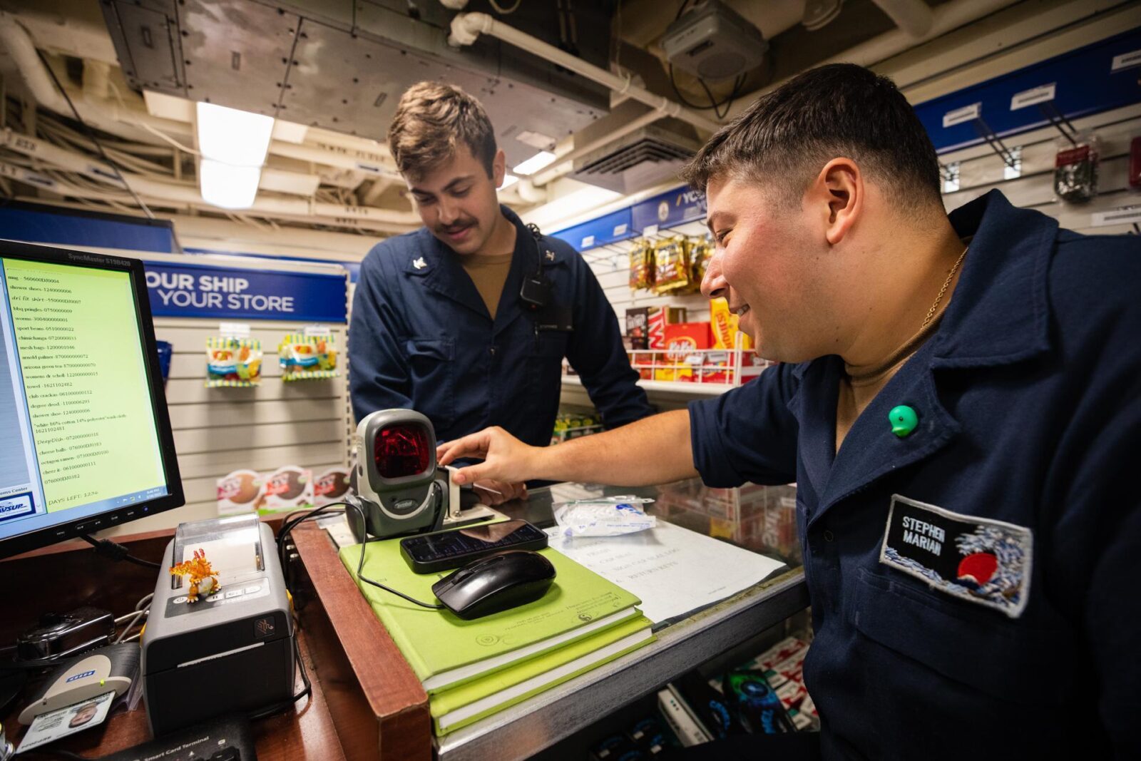 PHILIPPINE SEA (Mar. 17, 2023) U.S. Navy Retail Services Specialist Seaman Stephan Marian, right, from Pittsburgh, helps a customer in the ship store aboard the Ticonderoga-class guided-missile cruiser USS Bunker Hill (CG 52). Bunker Hill, part of the Nimitz Carrier Strike Group, is in U.S. 7th fleet conducting routine operations. 7th Fleet is the U.S. Navy’s largest forward-deployed numbered fleet, and routinely interacts and operates with Allies and partners in preserving a free and open Indo-Pacific region. (U.S. Navy photo by Mass Communication Specialist 3rd Class Jordan Jennings)