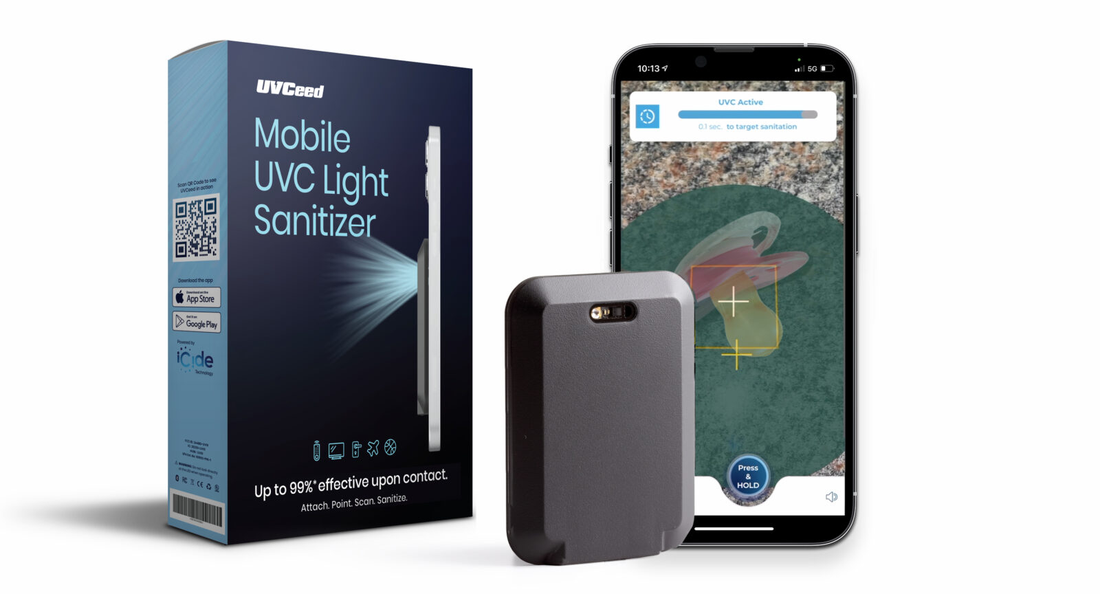 UVCeed, now available for both iOS and Android, attaches to the back of any smartphone for on-the-go protection. Unlike any other UV offering, UVCeed is the only device to leverage and fully maximize the smartphone’s processing power to guide users through the disinfection process. UVCeed ensures the proper time and distance are applied, and then notifies users when the targeted area has reached 99.9 percent disinfection. UVCeed is outfitted with powerful mercury-free LED UV light rays and multiple sensors, proprietary iCide smart dosage and iCide safety technology, and an intuitive app that gives users the power, visibility and confidence to protect themselves anytime, anywhere. It is the first artificial intelligence-powered UVC disinfectant system with a camera/app-based protection feature that is optimized for safety and simplicity. With the UVCeed device and app, users can actually see what is being disinfected in real time. No other device does this.