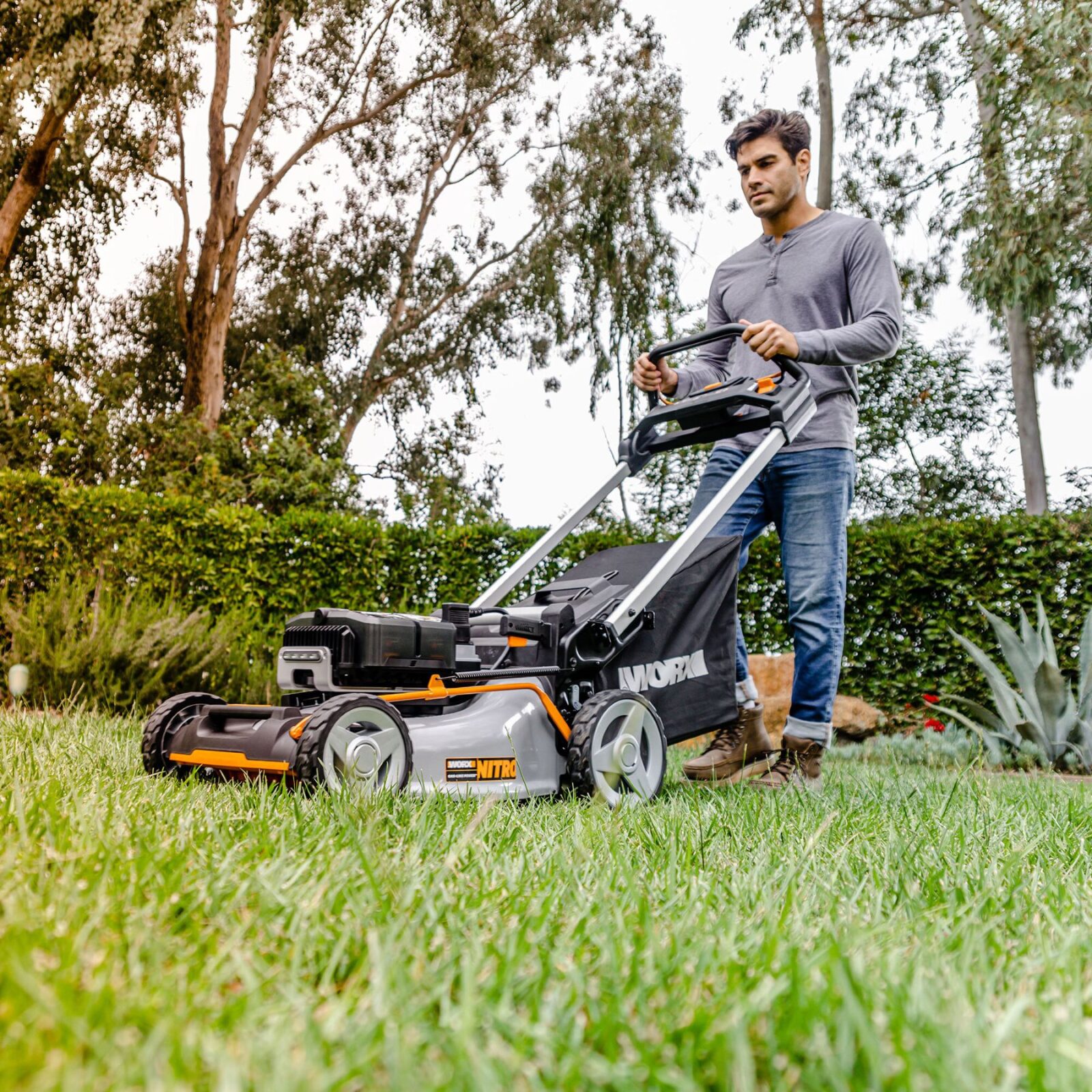 A self-propelled mower like the WORX Nitro 80V mower does most of the work while the homeowner guides it across the lawn. The mower’s pace is factory set to match the typical walking speed while mowing. It’s the mower’s transmission that drives the rear wheels, while a push mower is dependent solely on the effort by the user. Conversely, with a push mower it’s the homeowner doing the bulk of the work. Mowing with a push mower can be good exercise. Mowing with a push mower typically burns 350 to 450 calories depending on the person’s weight and mowing intensity.