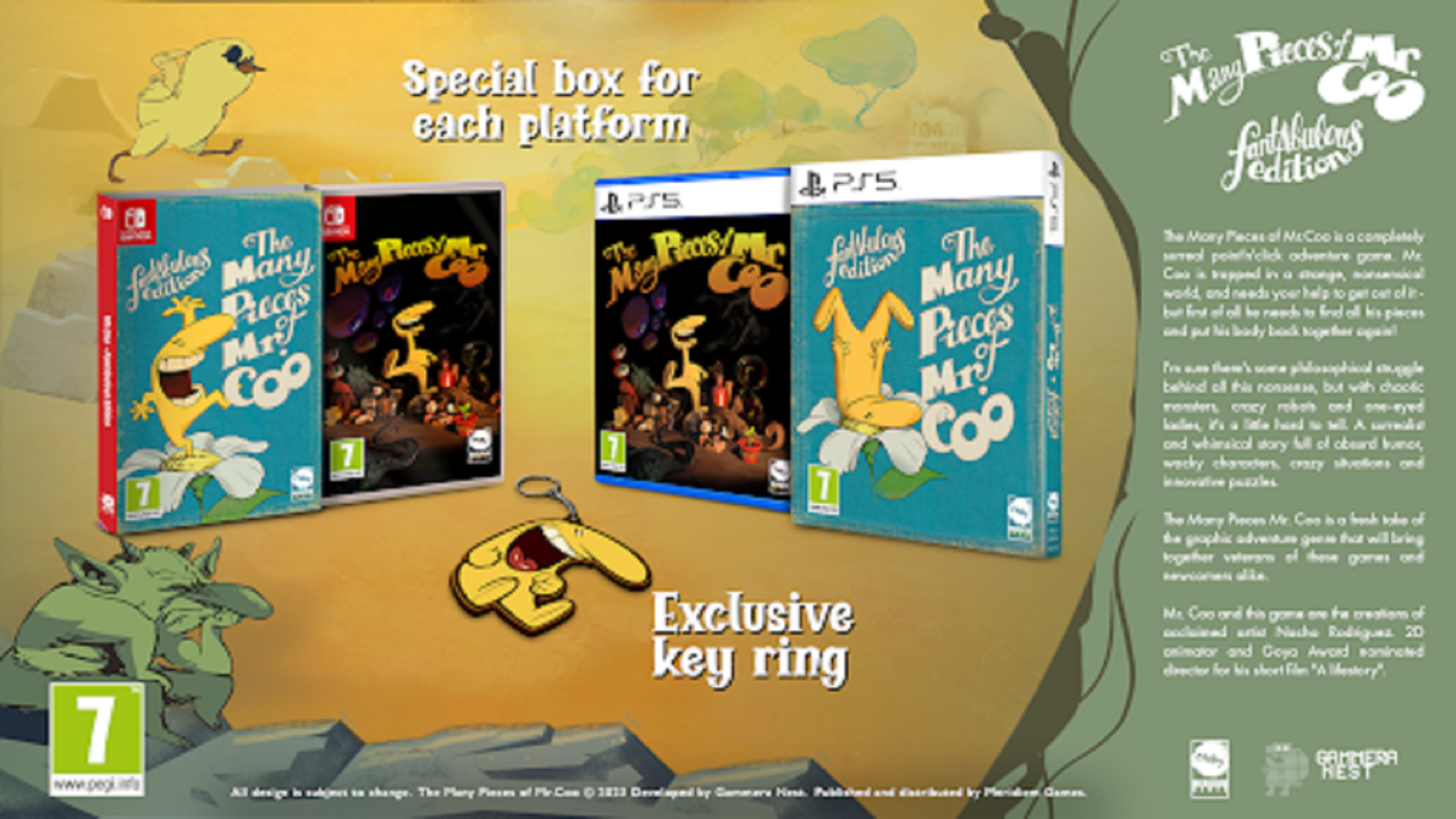 Meridiem Games will be responsible for the design, manufacture, and European distribution of the two special boxed editions. First up is a special boxed The Many Pieces of Mr. Coo – Fantabulous Edition for PlayStation 5 and Nintendo Switch, which will contain an exclusive Mr. Coo character keychain housed in an exclusively designed case with exclusive artwork for each platform.