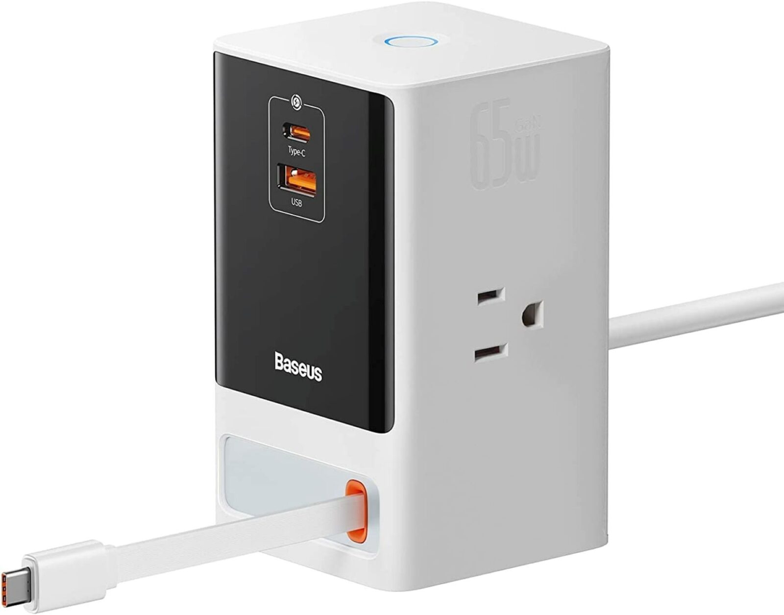 As a charger, it has 1 USB C supporting PD 65W, and a 60W USB A port, allowing users to charge a wide range of devices including smartphones, laptops, earbuds, tablets, and more. As a power strip, it offers 3 outlets to power up mid-consumption electronics like a monitor, printer, fax, PC, and more through a single power station, though, the maximum load is 1625W for using all 3 at a time. But what sets it apart, is that a handy 2.6ft retractable USB C cable is built-in, making charging any USB C devices a breeze by simply reaching the cable and pulling it to the appropriate length to keep your desk free of clutter and to save the effort of looking around for a charging cable. The idea behind this product is to streamline your production space.