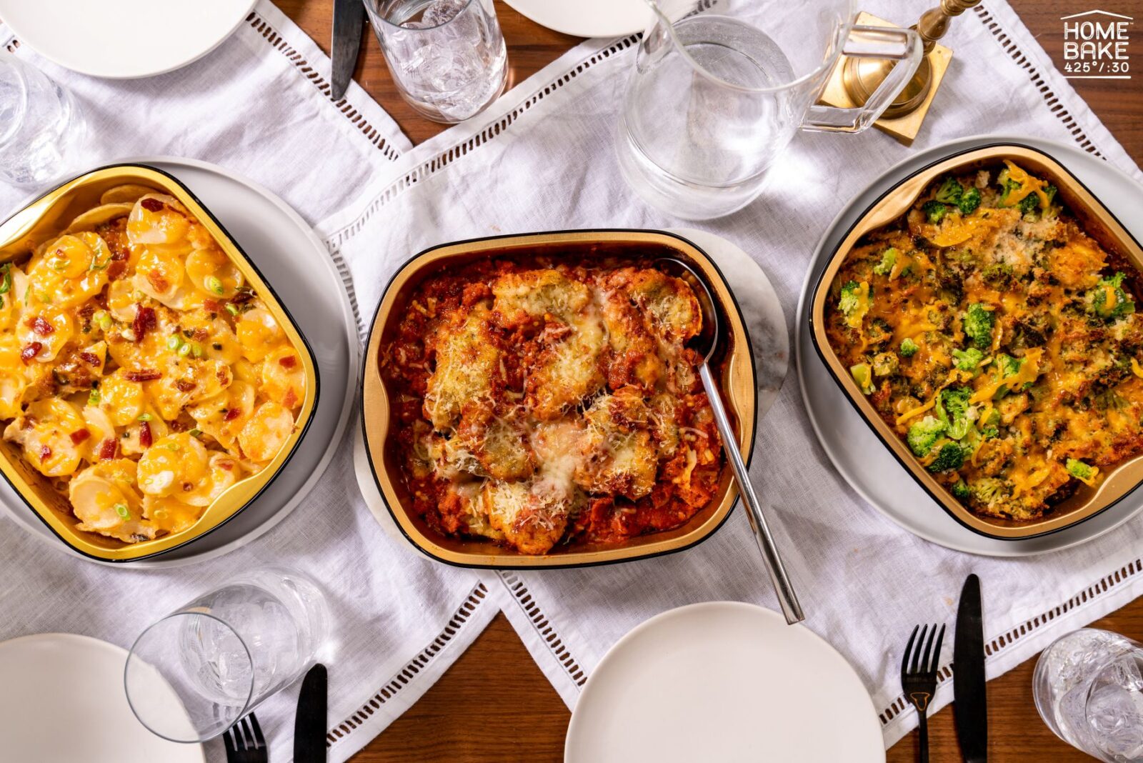 Consumers pick their entrée, side, and veggie of choice, place all three in the oven together, set the timer, and then plate piping hot and crave-worthy dinner right out of the trays – all while getting 30 minutes back in their day. HOMEBAKE 425°/:30 leverages proprietary roasting pan technology, ownable recipes, quality ingredients and a unique cooking process that allows mains, sides, and veggies to cook quickly and simultaneously, steaming for twenty-five minutes and then roasting for five.
