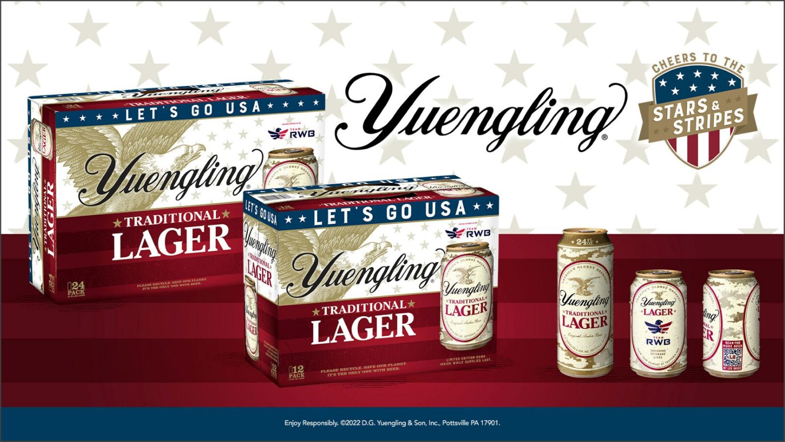 Each camo displays a QR code co-branded with American country music star and official Yuengling Traditional Lager and Stars & Stripes program Brand Ambassador, Lee Brice. When scanned, the QR code will immerse fans in a digital Stars & Stripes experience, inviting users to enter an exclusive giveaway to win a Lee Brice Party Pack; learn more about Team RWB and donate to the organization; listen to Lee Brice’s new album called “Hey World“; and tour America’s Oldest Brewery or shop online for Stars & Stripes merchandise.