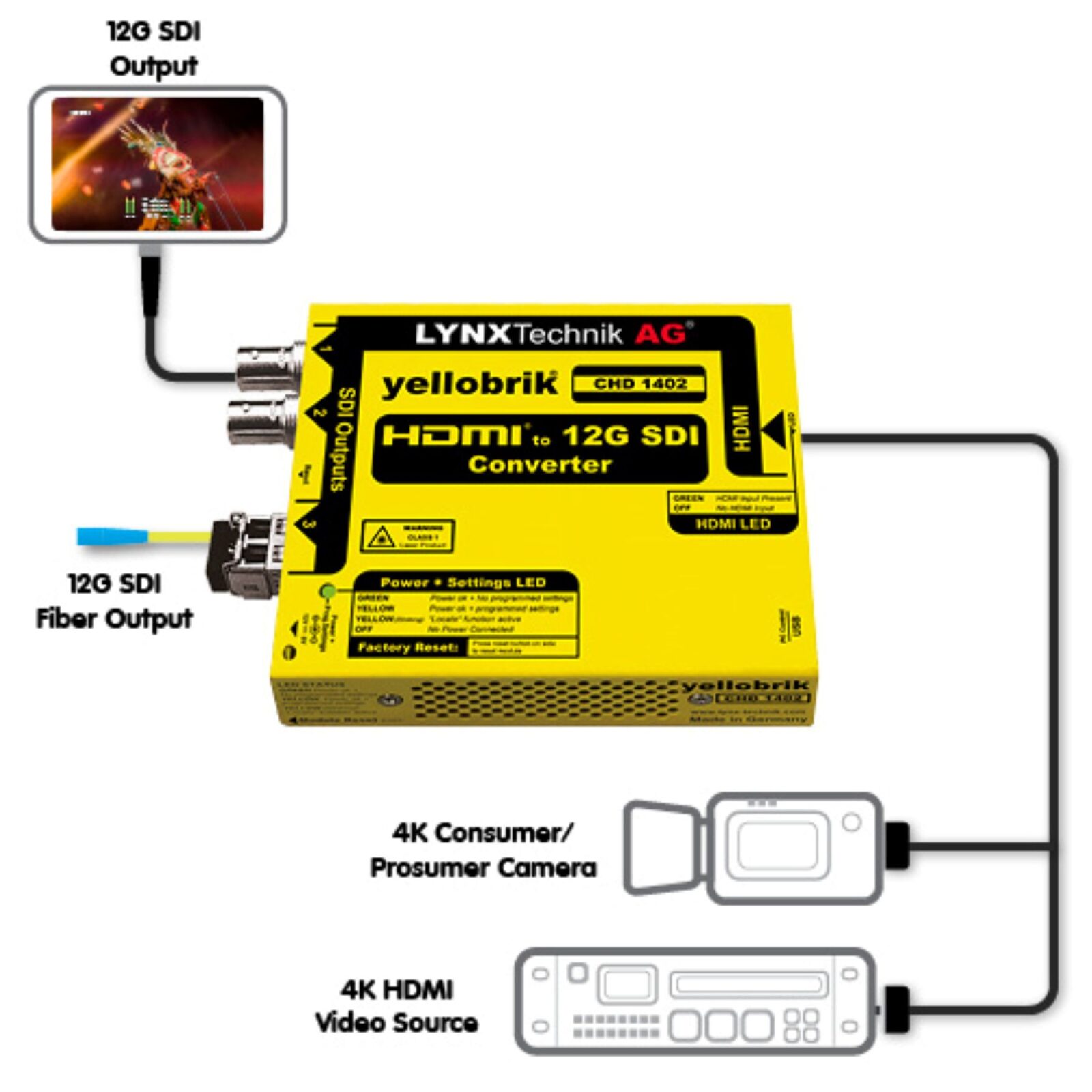 | LYNX Technik, provider of modular signal processing interfaces, announces the addition of a new HDMI to SDI converter (model: CHD 1402) to its popular yellobrik line. The CHD 1402 is designed for any AV, Broadcast, Production, or Post application that requires signal conversion from up to 4K HDMI to up to 12G SDI. It is the successor of the popular CHD 1802, which supports up to 3G SDI. A typical use case would be when a facility needs to convert an HDMI output from an external source, such as a video camera, into an SDI format. All audio present in the HDMI stream is passed transparently. With the SDI fiber output and SFP transmitter options, the SDI signal can then be transmitted over fiber to a remote location. In addition, a complementary yellobrik, the CDH 1411 SDI to HDMI converter could be used to provide the SDI output and an HDMI monitoring output in the remote location, including displaying audio, metadata, and timecode overlays. As with all yellobriks, the new CHD 1402 is compatible with the yelloGUI and LynxCentraal central software applications. When connected to the software, additional internal settings and functions can be accessed and controlled. The CDH 1402 is rack-mountable, it can be used as a standalone module, or in larger yellobrik system applications. This new yellobrik converter is now available.CLICK HERE for an image |
