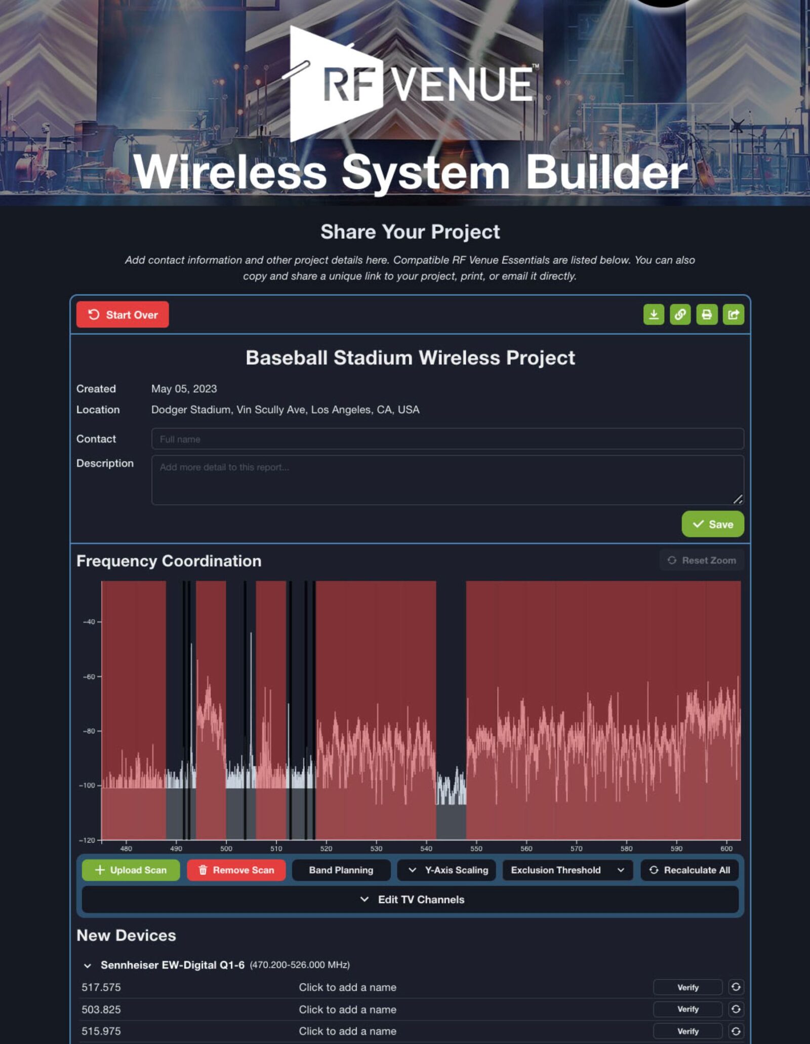Photo caption 1: Wireless System Builder app, a free web-based tool for designing and deploying wireless microphones and in-ear monitors from RF Venue, has been updated with the addition of automatic frequency coordination and spectrum scan file upload capabilities to its location-based recommendations based on continuously updated FCC TV spectrum data
