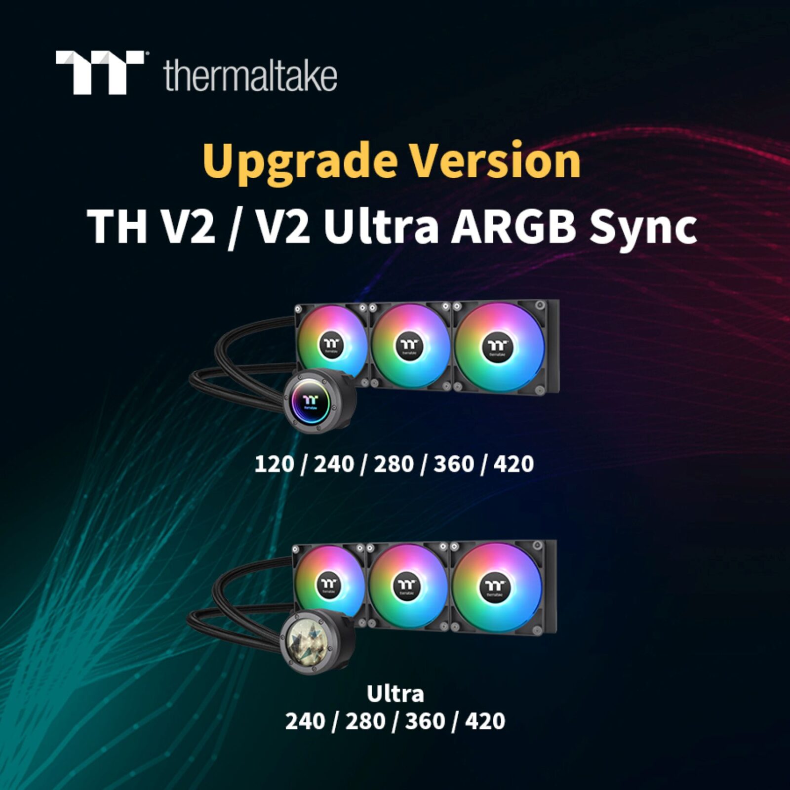 Thermaltake, the leading PC DIY premium brand for Case, Power, Cooling, Gaming peripherals, and enthusiast Memory solutions, presents the TH V2 ARGB Sync and the TH V2 Ultra ARGB Sync, the 2nd generation of the TH Series All-in-one liquid cooler. Coming in 120, 240, 280, 360, and 420 models, TH V2 Series incorporates an Infinity Mirror Lighting Design on the water block, bringing a futuristic lighting illusion to Thermaltake’s AIO product line. Additionally, the TH V2 Series AIO Liquid Coolers are equipped with our brand new CT120/CT140 ARGB Sync Fans which run up to 2000/1800 RPM, delivering solid cooling performance to your PC. On top of that, these AIOs come with a newly designed low-profile radiator with a rectangular exterior, with the tube’s length s extended to 460mm to fit in larger sizes of chassis. The TH V2, being Thermaltake’s next-gen entry-level all-in-one liquid cooler, combines both splendid lighting effects and solid performance. Now users get to have more ways to experience these products at a more affordable price point.