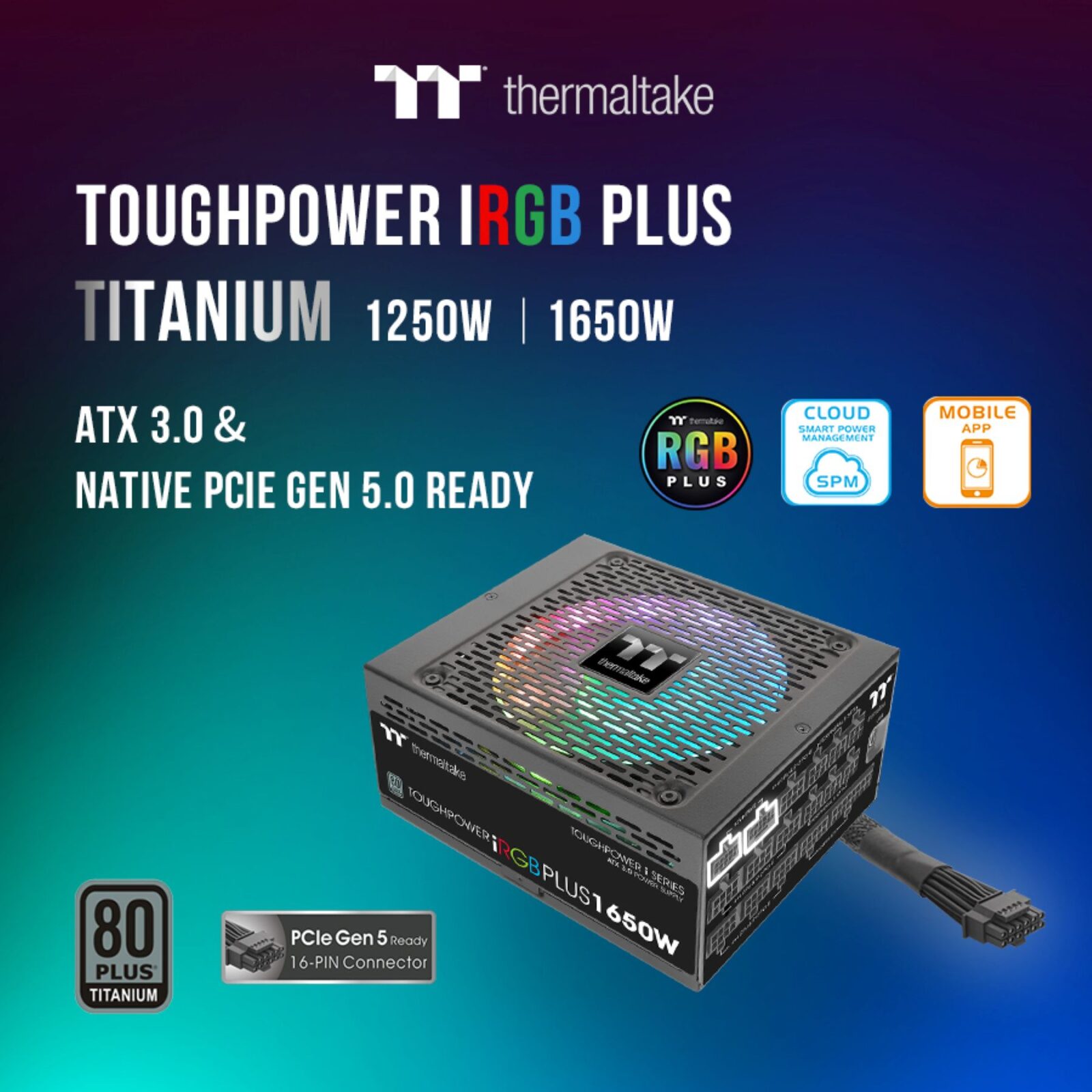 Designed as a sophisticated digital power supply, the Toughpower iRGB PLUS Titanium series features Intel ATX 3.0 specifications and is PCIe Gen 5.0 ready, 80 PLUS Titanium certified, patented 16.8 million-color Riing Duo 14 RGB fan with 18 addressable LEDs, and Smart Power Management support. The Toughpower iRGB PLUS 1250W/1650W Titanium is the ideal power supply to fit your high-specification hardware and enjoy intelligent digitalization!