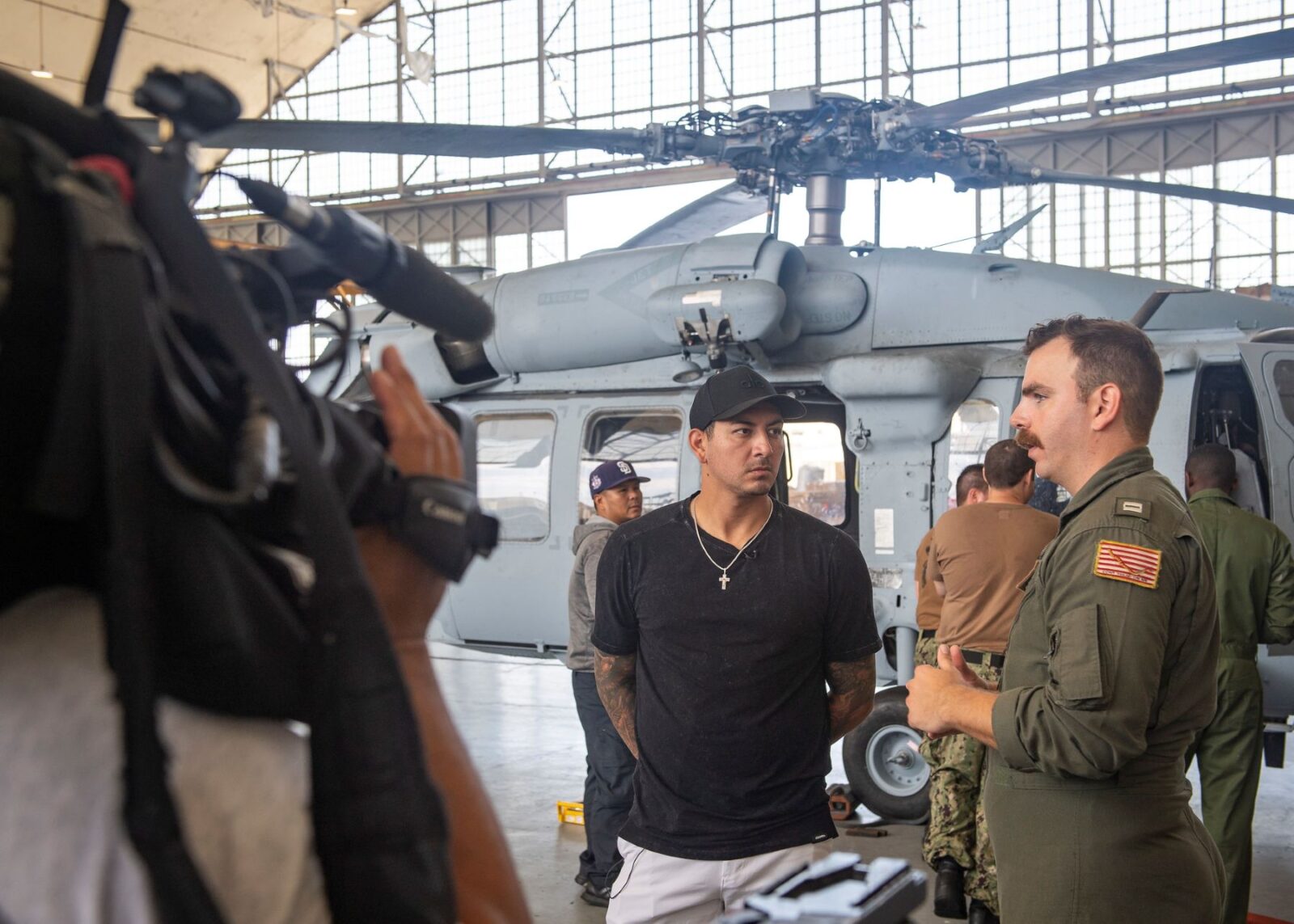 Pittsburgh Pirates pitcher Vince Velasquez, center, speaks with Lt. Brendan McGinnis, a Pittsburgh native assigned to the “Wildcards” of Helicopter Sea Combat Squadron (HSC) 23, during a tour of the HSC-23 hangar on Naval Air Station North Island, Calif., July 25, 2023. HSC-23 is an expeditionary MH-60S Sea Hawk and MQ-8B Fire Scout helicopter squadron that supports deployed Pacific Fleet warships. (U.S. Navy photo by Mass Communication Specialist 2nd Class Aron Montano)