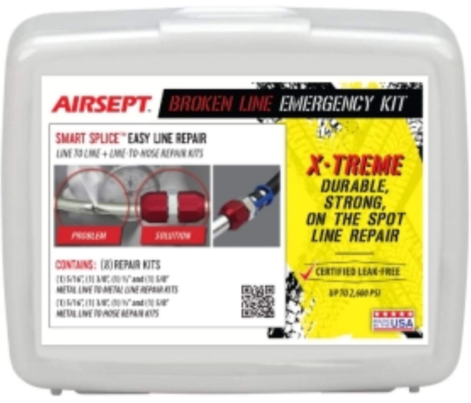 The eight Smart Splice repair solutions can be used to fix a line or hose leak or break in minutes. Designed to be especially durable in high vibration applications, the AirSept Broken Line Emergency Kit utilizes fittings that are OE approved and can be installed with a standard wrench.