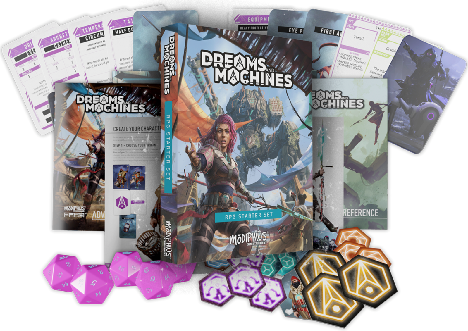 Dreams and Machines Starter Set Contents: Tutorial Booklet, Adventure Booklet, Rules Reference Booklet, 5 twenty-sided dice, 152 tokens, 42 player character cards, 26 equipment cards, 52 NPC cards, 31 illustrated location cards, 13 Knowledge Fragment handouts, 7 character save envelopes, and 7 rules reference cards