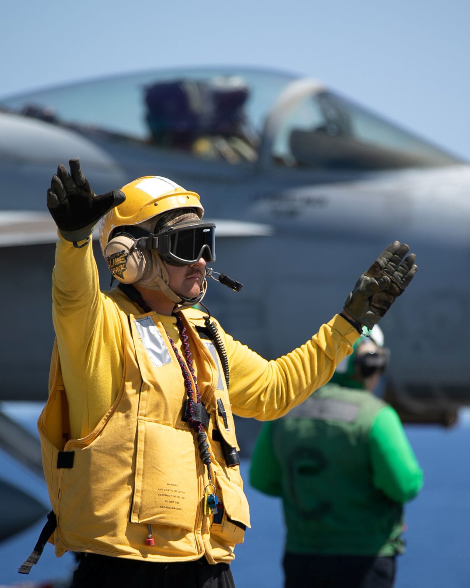 Aviation Boatswain’s Mate (Handling) 2nd Class Trevor Prosser, from Pittsburgh, assigned to the world’s largest aircraft carrier USS Gerald R. Ford’s (CVN 78) air department, directs aircraft during flight operations, Aug. 7, 2023. Forces from Standing NATO Maritime Group 2 and the Gerald R. Ford Carrier Strike Group are conducting the Sage Wolverine series of high-end maritime training events in the central Mediterranean Sea to increase NATO interoperability and promote regional peace and stability. (U.S. Navy photo by Mass Communication Specialist 2nd Class Jackson Adkins)