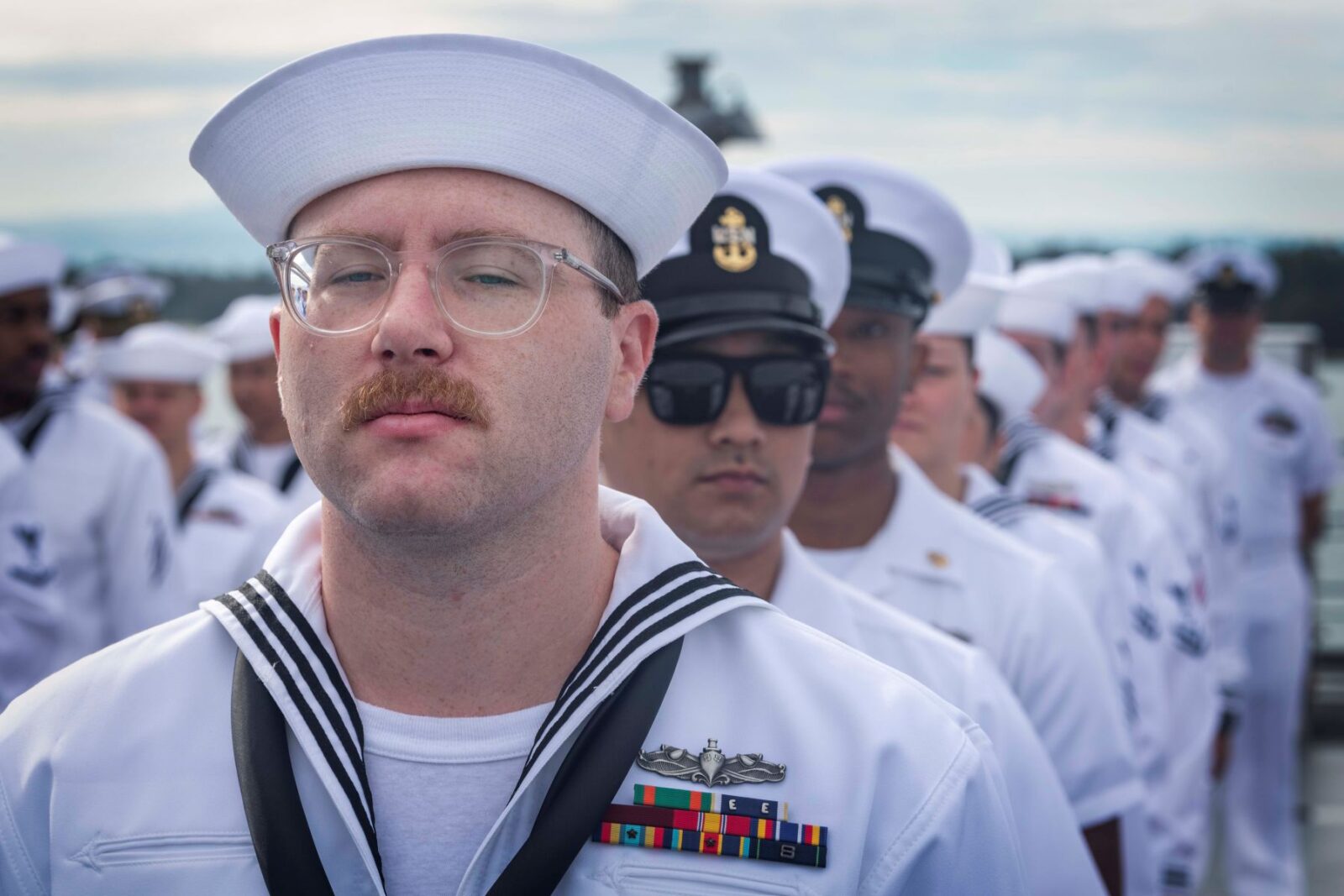 MUARA, Brunei (Aug. 3, 2023) – Electronics Technician 2nd Class Brandon Kendall, from Pittsburgh, prepares to man the rails on the main deck of U.S. 7th Fleet’s flagship USS Blue Ridge (LCC 19) while arriving at Port Muara, Brunei, Aug. 3. Blue Ridge is the oldest operational ship in the Navy and, as 7th Fleet command ship, routinely interacts and operates with allies and partners in preserving a free and open Indo-Pacific region. (U.S. Navy photo by Mass Communication Specialist 2nd Class Matt Hall)