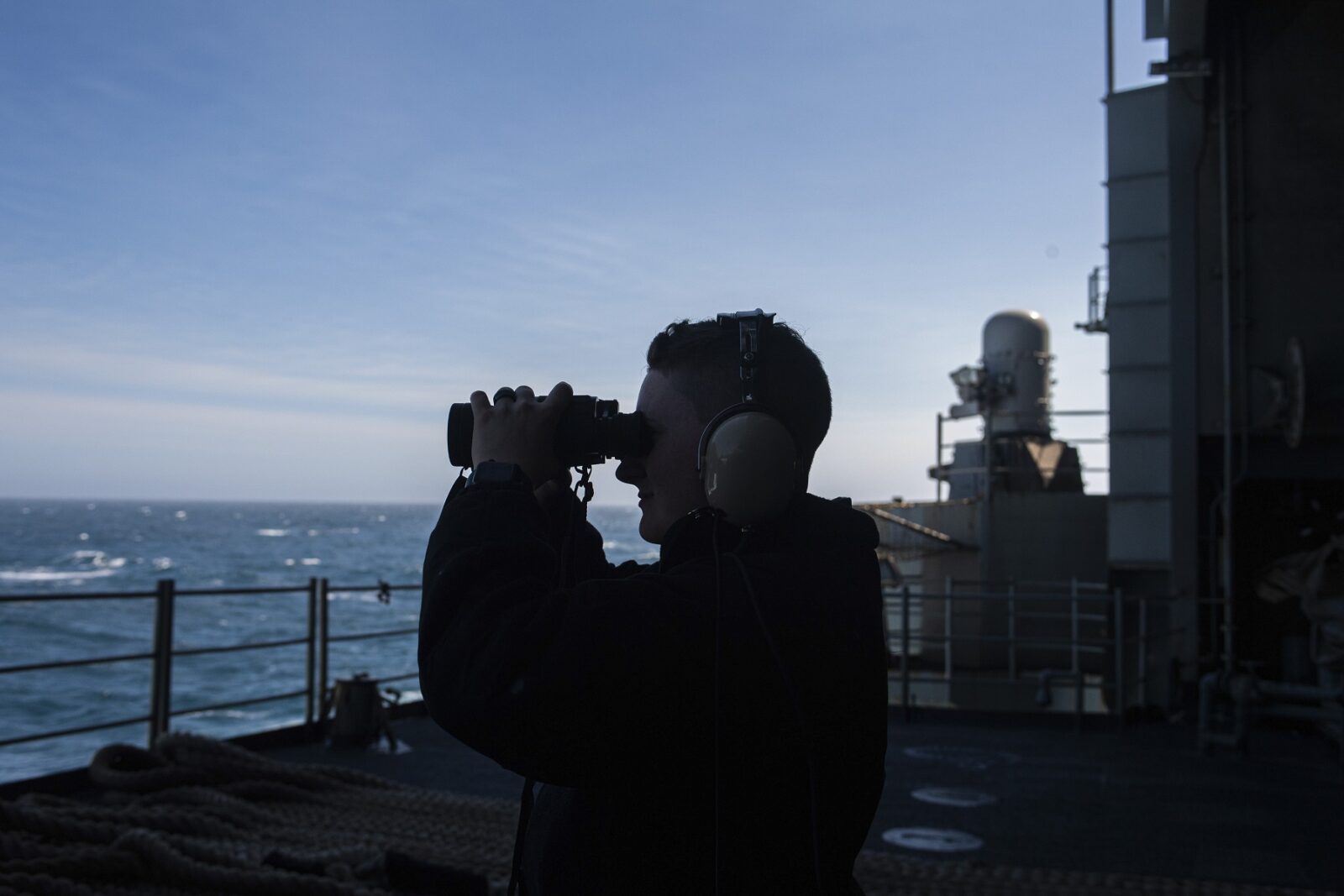 230814-N-AM483-1068 PACIFIC OCEAN (Aug. 14, 2023) Seaman Talon Miller, from Pittsburgh, stands lookout watch on the fantail of the aircraft carrier USS Nimitz (CVN 68). Nimitz is underway conducting routine operations. (U.S. Navy photo by Mass Communication Specialist Seaman Peter McHaddad)