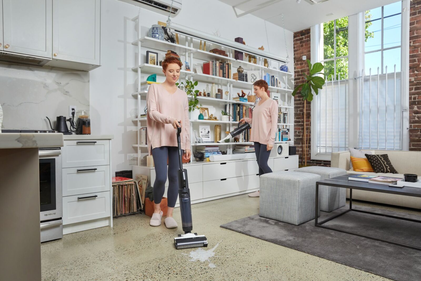 The FLOOR ONE S5 wet and dry vacuum cleaners are equipped with the exclusive iLoop™ Smart Sensor technology from Tineco, which automatically adjusts suction, water flow, and brush roll speed to clean all dirty surfaces. The FLOOR ONE mops and vacuums in one step, leaving floors completely dry and streak-free in just a few minutes. This halves the time it takes to clean the floors.