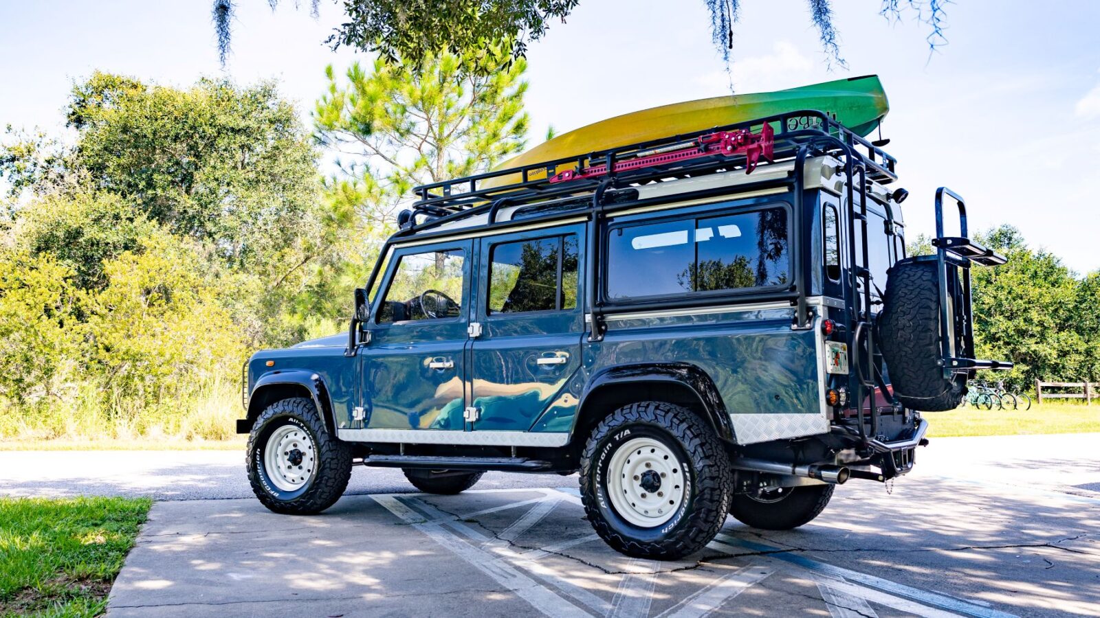 Additional Features — Fabbri-Gringo ski rack and 2 bike rack attachment in Arles Blue, Hi-Lift heavy duty jack in red, 4 HELLA 500 series round spotlights with black grille – 2 on each side, 2 HELLA amber driving lights with black grille – mounted to front bumper, 2 LED round work lights on each side of rear gate, swing away wheel carrier
