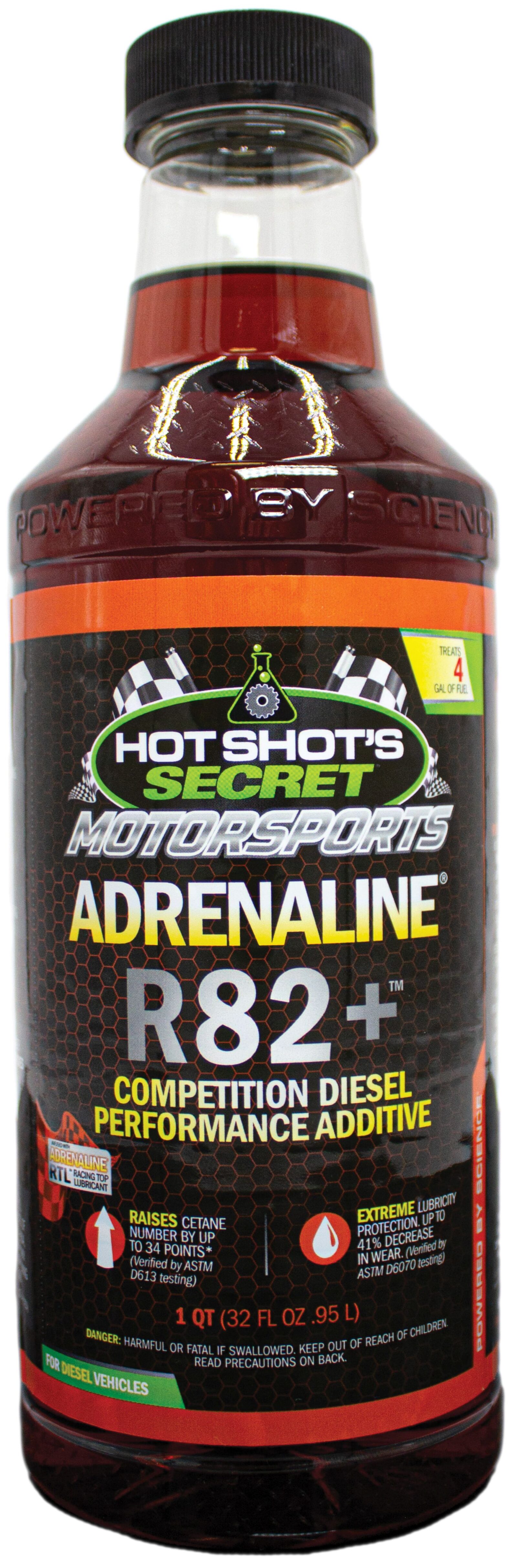 Hot Shot’s Secret ADRENALINE R82+ meets most diesel race sanctioning body requirements when used as directed. Add 1-quart of R82+ to every 4 gallons of diesel fuel. R82+ is for off-road use and is suitable for both mechanically injected diesel engines as well as all common rail applications. For more information, view this video.