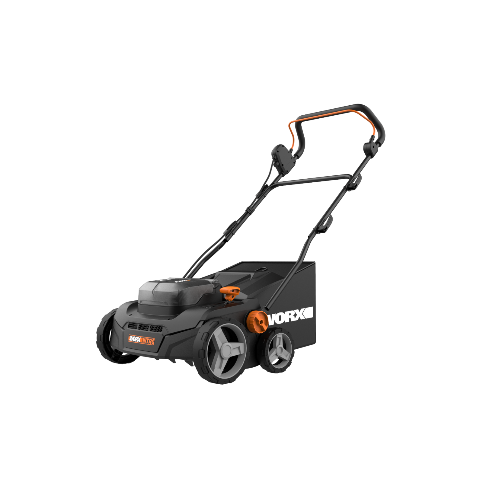 The WORX 40V 14 in. Dethatcher features two dethatching reels, a comfort-wrapped adjustable handle that folds down for collapsible storage, a 1.1 bushel collection bag, two 20V 4.0Ah batteries, and a 4 amp dual-port charger. The dethatcher is covered by the WORX five-year limited warranty.