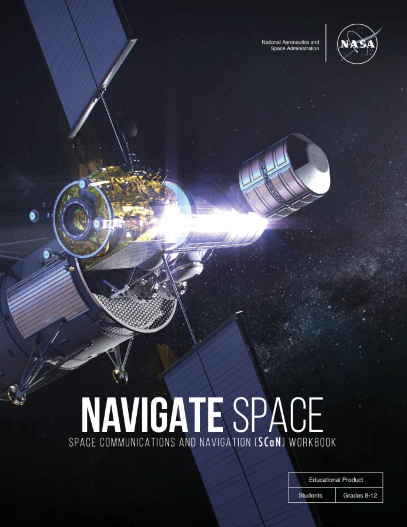 Image of a space station with a starry background. The text reads "Navigate Space: Space Communications and Navigation (SCaN) Workbook)"