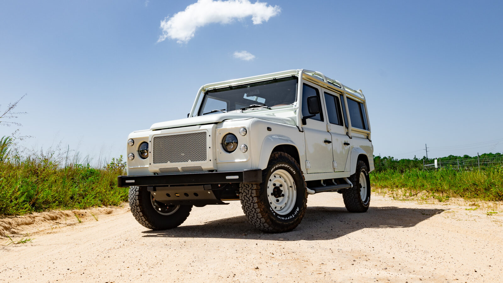 Charming rustic accents continue inside with the wooden steering wheel, Nostalgia VT gauges and artfully pre-distressed tan leather dashboard. On chilly days in North Carolina, the driver and front-row passenger can take advantage of the luxe matching heated leather racing seats with old-school diamond stitching. The older Defender has space for an additional six to tag along on day trips to the Blue Ridge Mountains, with four inward-facing jump seats in the load area. Cutting-edge audio – JL Audio speakers, duo Kenwood subwoofers, CarPlay and Bluetooth – round out advanced tech enhancements.