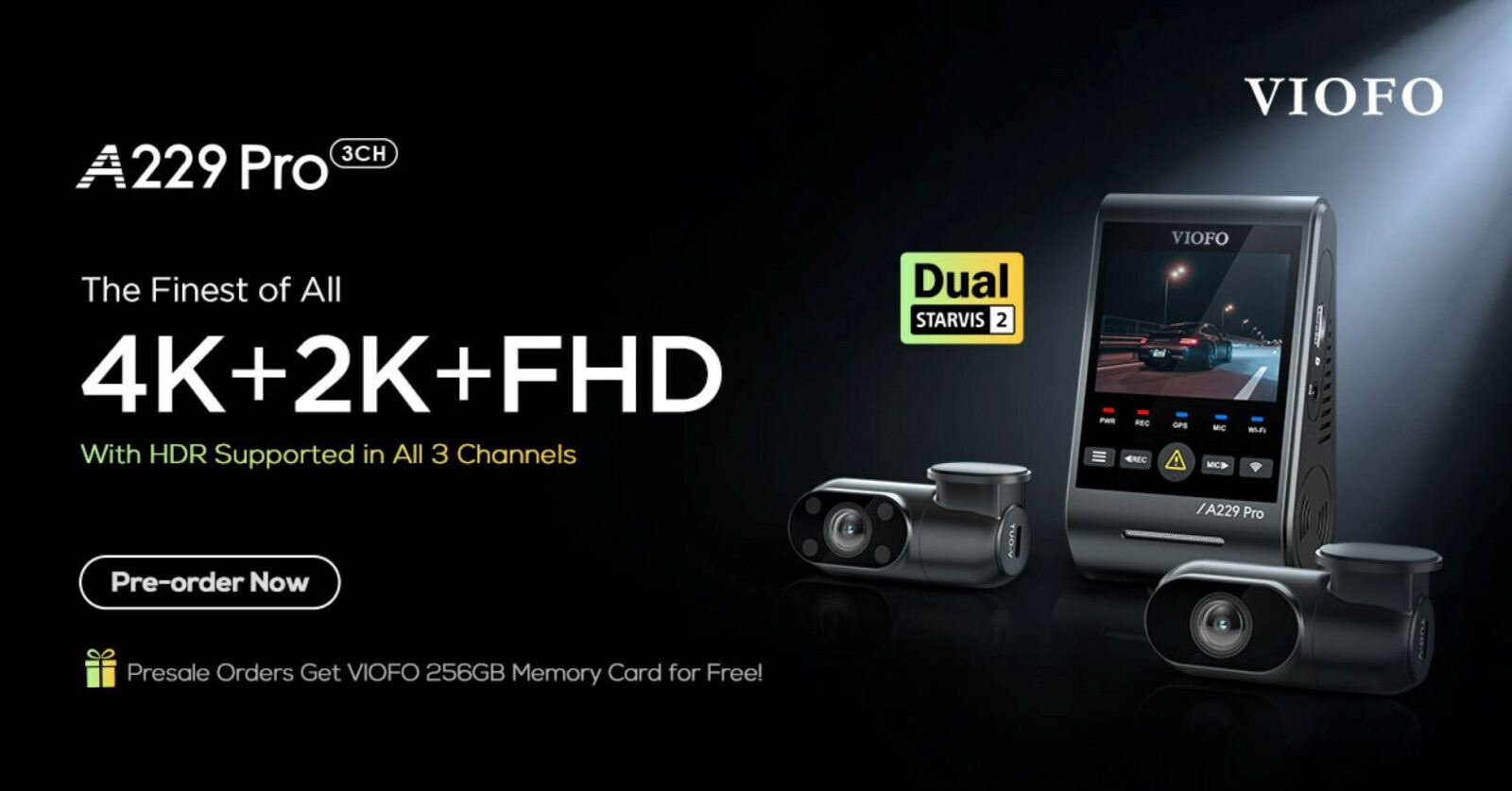 VIOFO, is thrilled to announce the official launch of the unrivaled 4K+2K+1080P dash cam – A229 Pro. This new dash cam supports up to 3 channel recording, all supporting HDR, aimed at capturing every moment with stunning clarity. Utilizing state-of-the-art Sony STARVIS 2 technology for both front and rear cameras, the A229 Pro dash cam enables unmatched 4K+2K recording and promises an unparalleled driving experience.