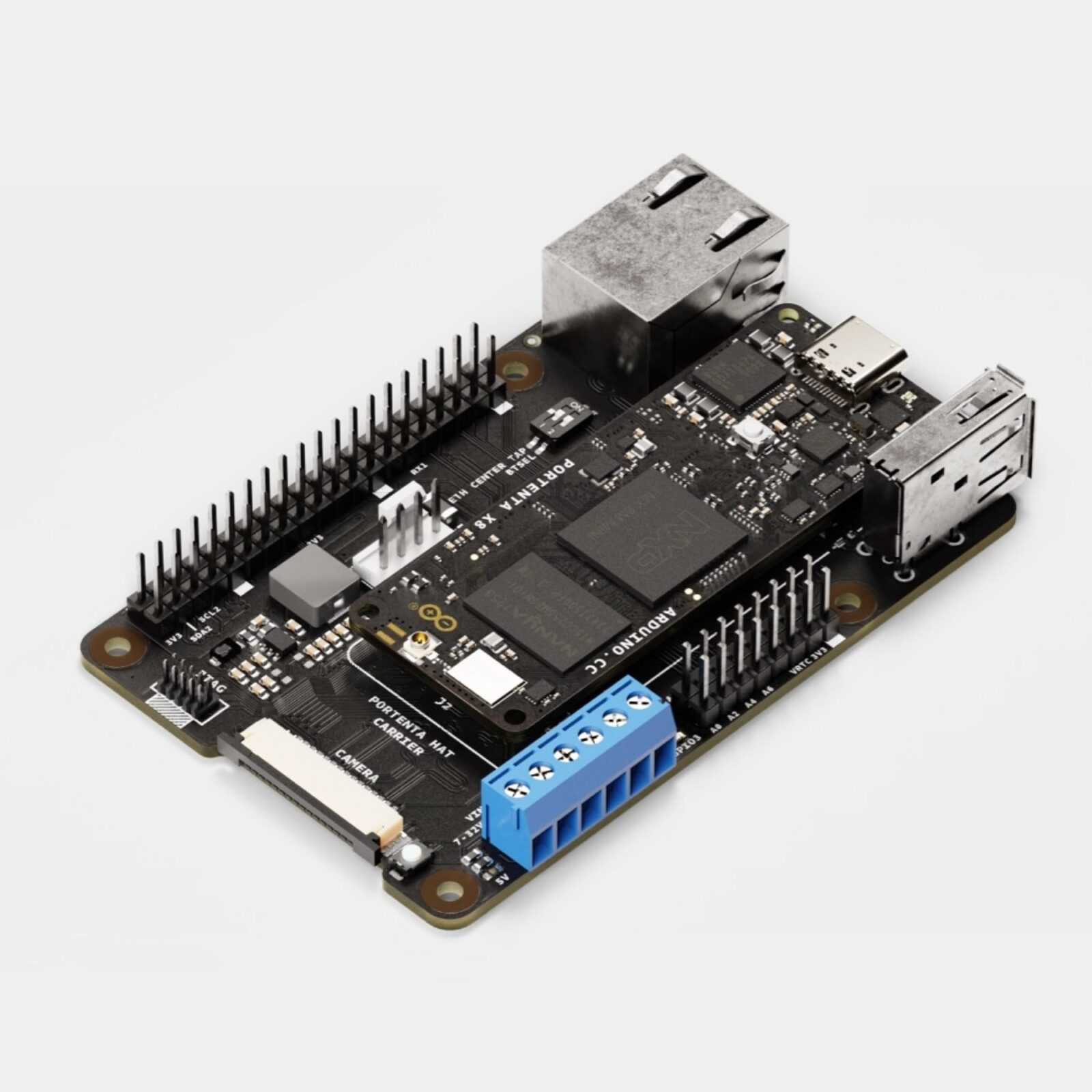 Portenta Hat Carrier is also compatible with Portenta H7 and Portenta C33 systems on modules. The carrier board enables any Portenta module easy expansion to multiple peripherals, including any Raspberry Pi® HAT compatible with the Model B 40-pin header, Ethernet, microSD and USB.