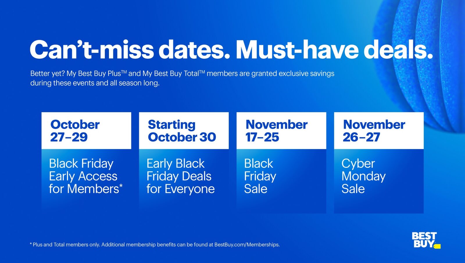 The holiday excitement is snowballing at the tech playground. Today, Best Buy announced its full lineup of can’t-miss holiday shopping dates, beginning with Black Friday Early Access for Members on Oct. 27 and Early Black Friday Deals for Everyone on Oct. 30.