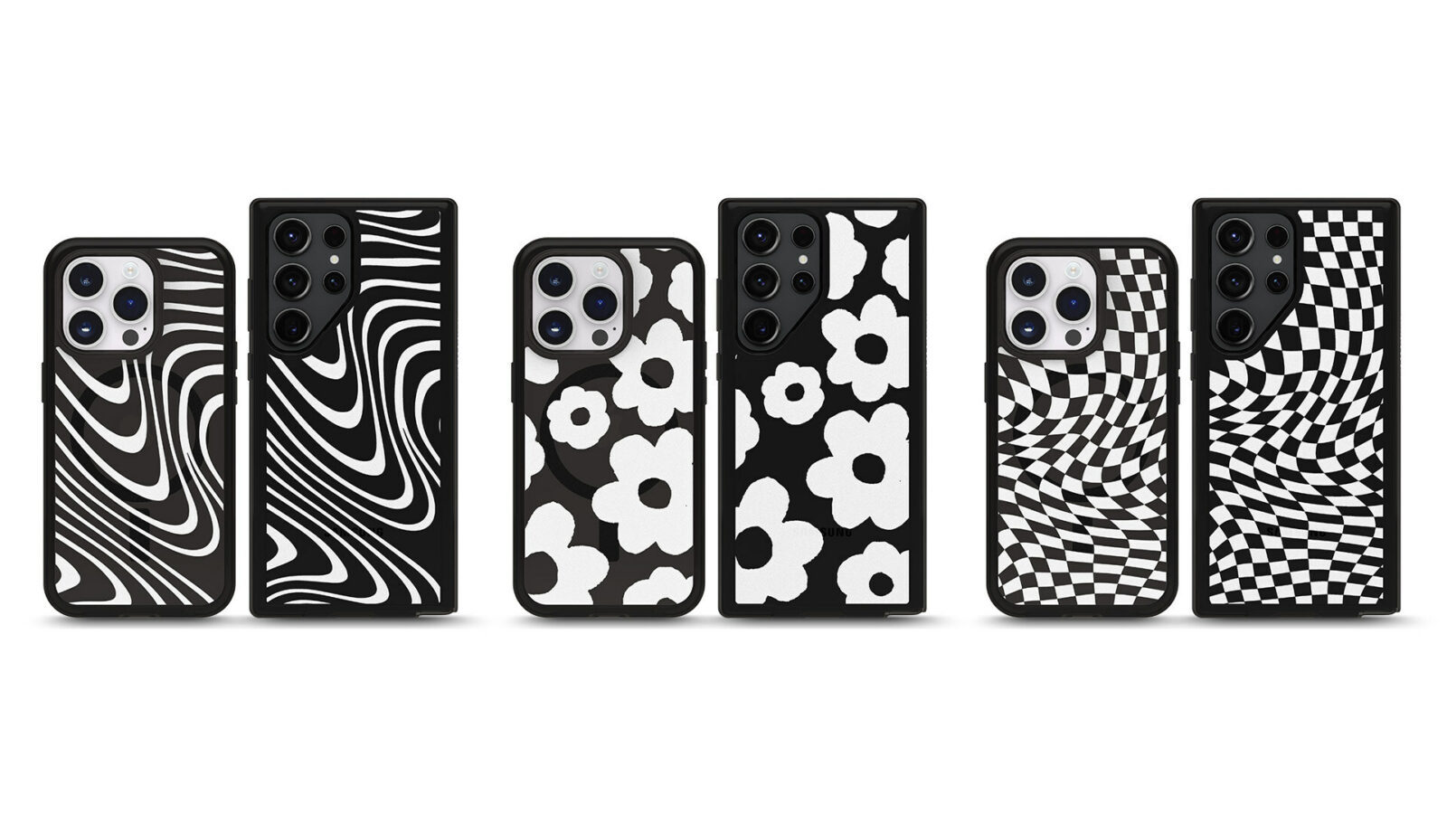 Three all-new designs on Symmetry Series cases protect Apple and Samsung devices with a chic new style. Wavy checker, retro floral and psychedelic swirl black and white cases are the perfect collection for anyone throughout the year.