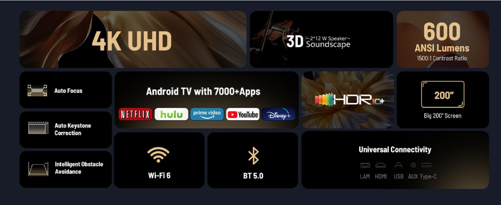 Furthermore, to accommodate varying display environments and the need for portability, the technology incorporates auto keystone correction and autofocus, ensuring instant recalibration and clarity when users move the projector, along with obstacle avoidance for a seamless and immersive viewing experience.