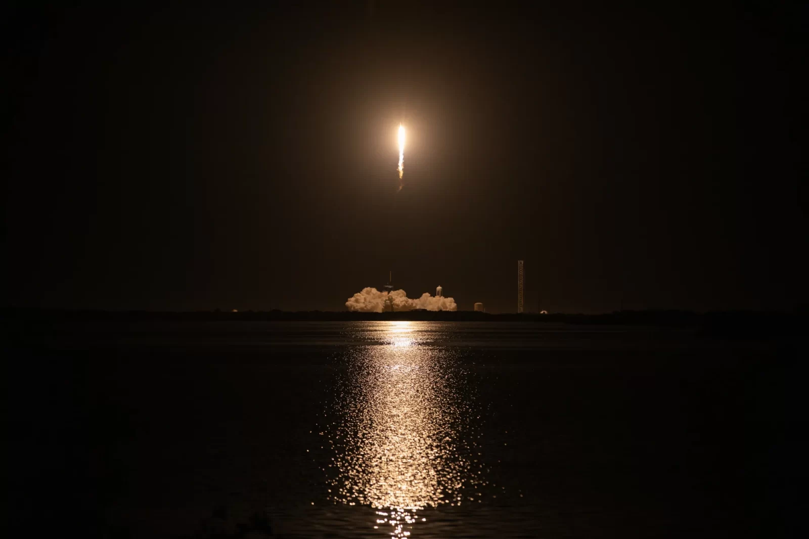 In this photo from Nov. 9, 2023, a SpaceX Falcon 9 rocket illuminates the water as it launches at night from NASA’s Kennedy Space Center in Florida. The 29th commercial resupply mission of the Cargo Dragon spacecraft brought new scientific research, technology demonstrations, crew supplies, and hardware to the International Space Station, including NASA’s Integrated Laser Communications Relay Demonstration Low Earth Orbit User Modem and Amplifier Terminal (ILLUMA-T) and Atmospheric Waves Experiment (AWE).