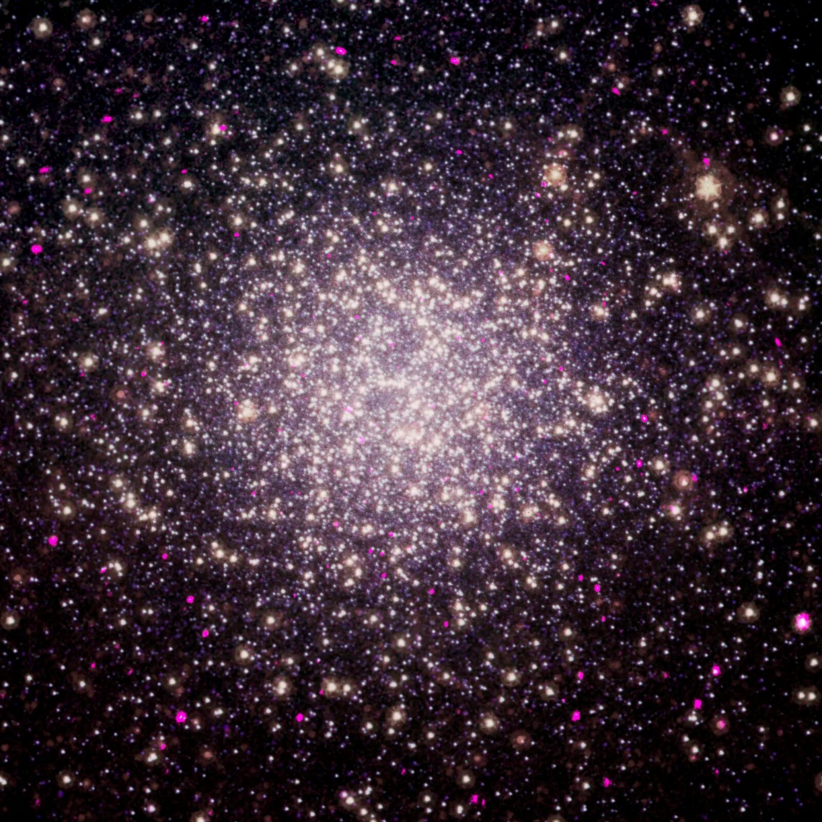 A close-up image of Omega Centauri, in X-ray & optical light, shows the locations of some of the spider pulsars. Spider pulsars are a special class of millisecond pulsars, and get their name for the damage they inflict on small companion stars in orbit around them.