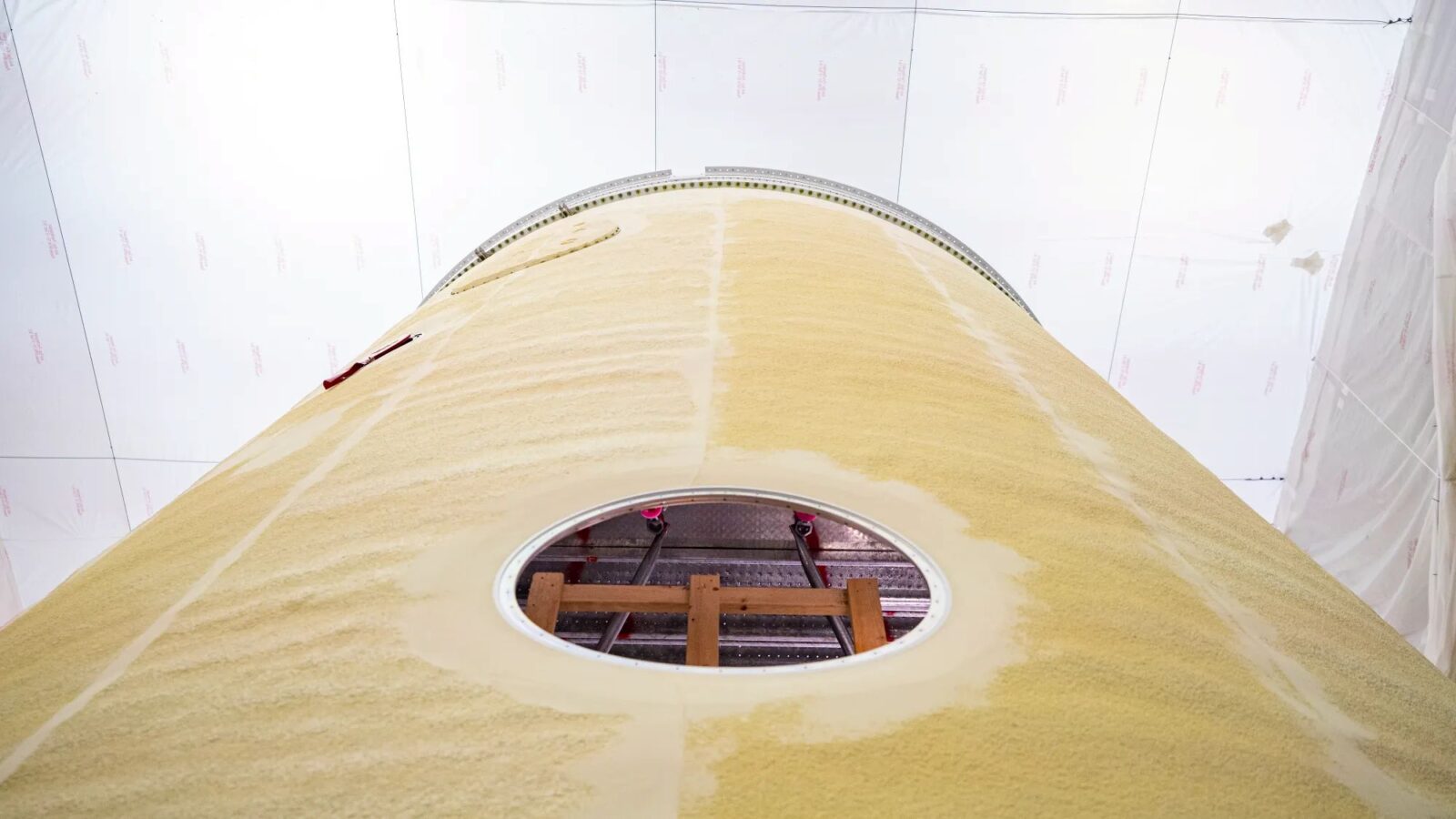 The cone-shaped launch vehicle stage adapter, seen in yellow, is in a production area.
