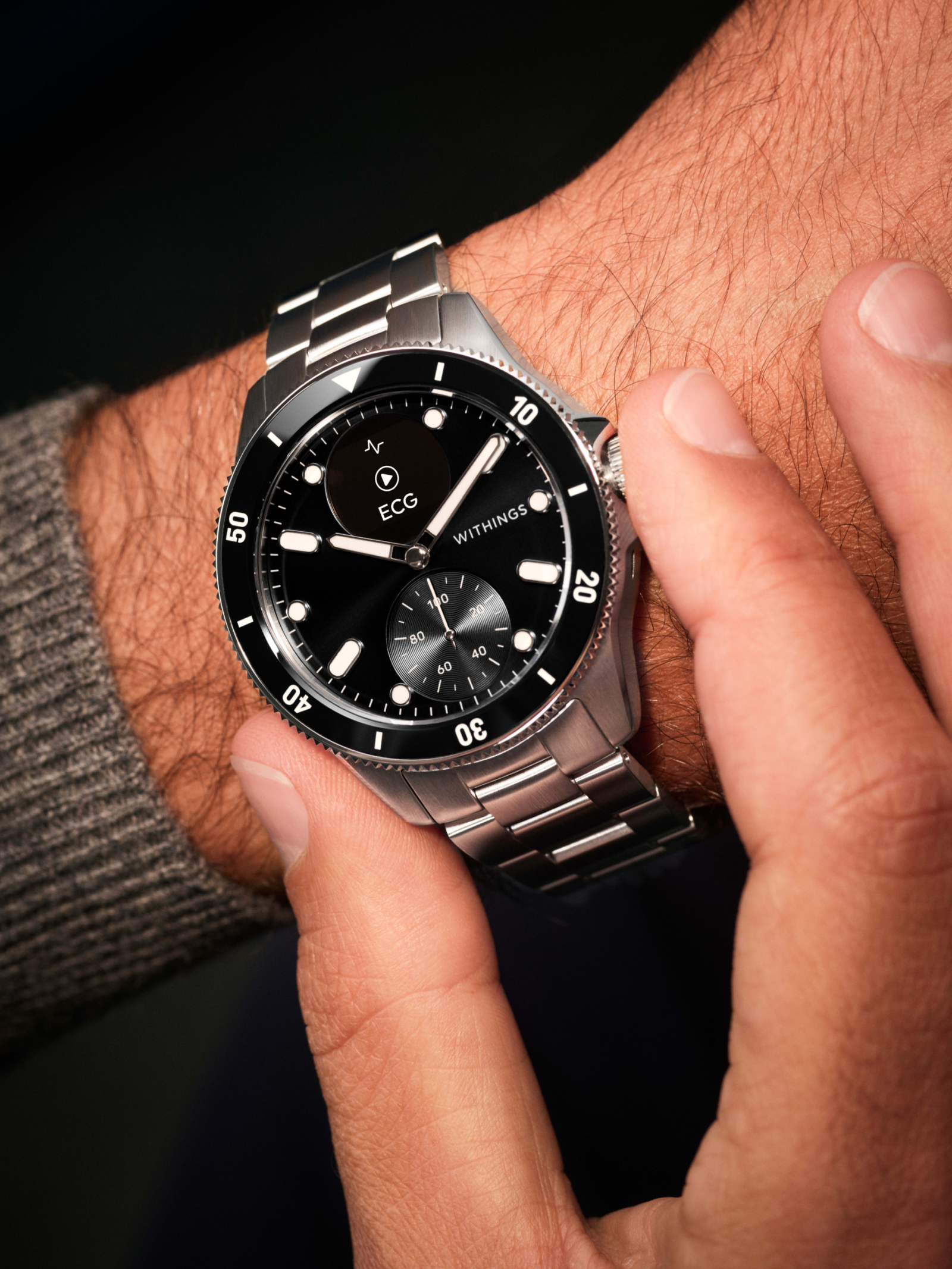 - On-demand medical-grade electrocardiogram: ScanWatch Nova performs an on-demand medical-grade electrocardiogram[1] to detect potential heart anomalies at any time, such as atrial fibrillation, which is one of the most prevalent forms of arrhythmias characterized by irregular heart rhythms. Nearly 2 million signs of AFib have been identified on ScanWatch since 2020. In just 30 seconds, through two built-in electrodes by simply touching the bezel with the hand, users can launch an ECG reading with live-results on the Withings app.