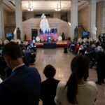 Left: Apollo 11 astronauts Michael Collins, left, Edwin E. “Buzz Aldrin, and Neil A. Armstrong each addressed a Joint Meeting of Congress, with Vice President Spiro T. Agnew and Speaker of the House John W. McCormack seated behind them. Middle: Apollo 11 astronauts’ wives Joan Aldrin, left, Patricia Collins, and Janet Armstrong receive recognition in the Visitors Gallery of the House Chamber. Right: The Apollo 11 astronauts and their wives cut at a cake at a reception at the Capitol.