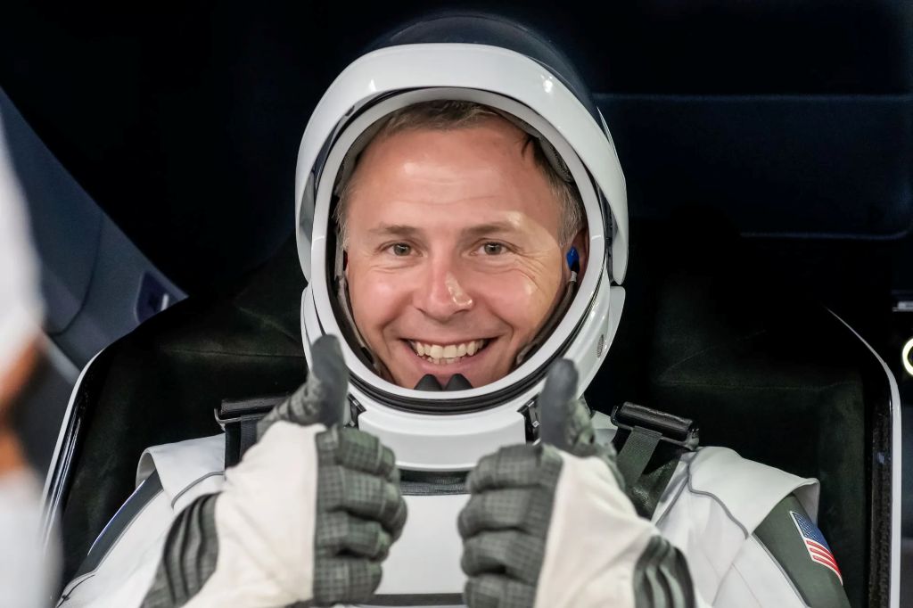 NASA’s SpaceX Crew-9 Commander Nick Hague smiles and gives two thumbs up during the crew equipment interface test at SpaceX’s Dragon refurbishing facility at Kennedy Space Center in Florida.