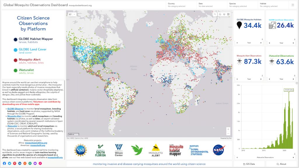 Screenshot of the Global Mosquito Observations interactive dashboard that combines various types of observations from data streams into an interoperable visualization. Each color-coded dot represents a citizen scientist’s observation and can be clicked to access the associated photos and data.